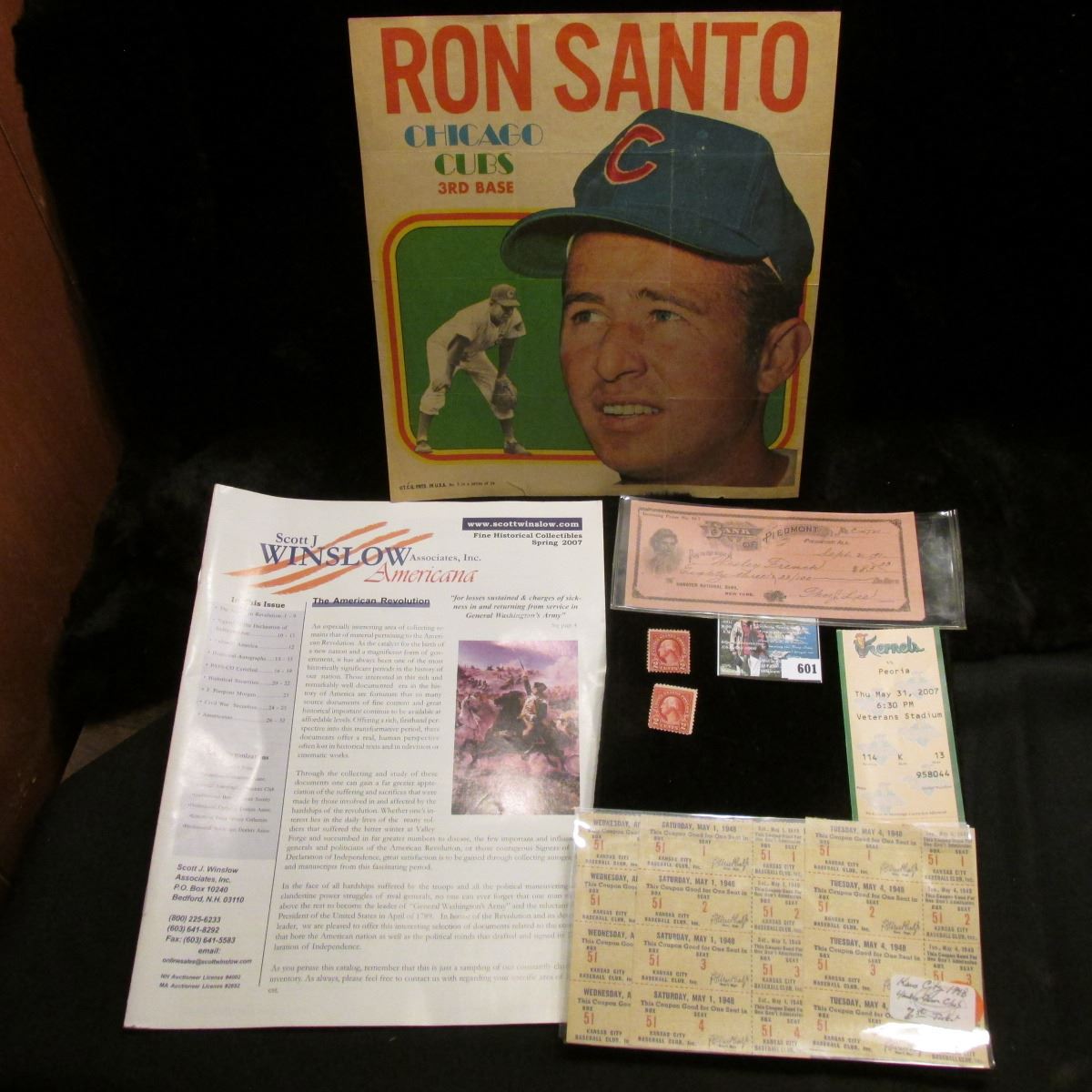 Spring 2007 "Scott J. Winslow Associates, Inc. Americana" Fixed Price Magazine; pair of mint Two Cent George Washington Stamps; 2007 Ticket for Kernels vs. Peoria ticket; group of 1948 Kansas City Baseball Club Tickets; "Bank of Piedmont" College Currency Scrip; & "Ron Santo Chicago Cubs 3rd Base" Poster.