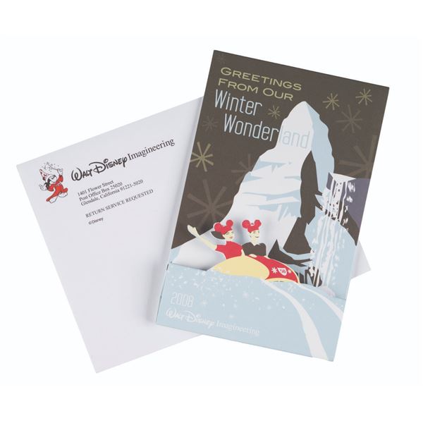 (Disney, 2008) A Walt Disney Imagineering Christmas card commemorating the 50th anniversary of the Matterhorn Bobsleds attraction. Measuring 3.5&quo...