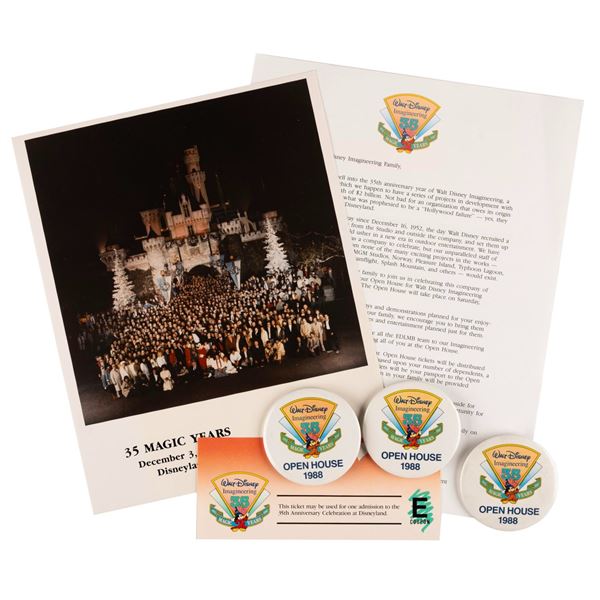 (Disneyland, 1992) A collection of items celebrating the 40th anniversary of Walt Disney Imagineering, including a pair of holiday party 40th pinback