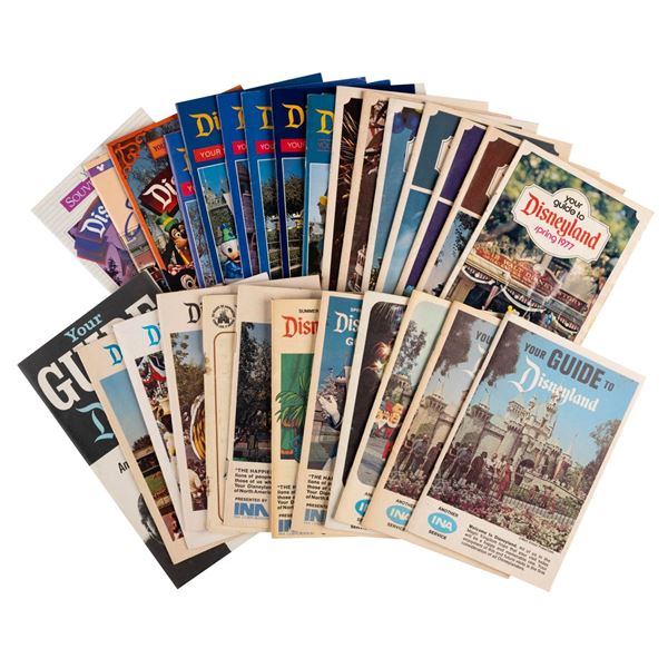 (Disney, 1976-1987) A collection of Walt Disney Travel Co. items featuring three magazines, four brochures, two luggage tags, three notepad pages, a s