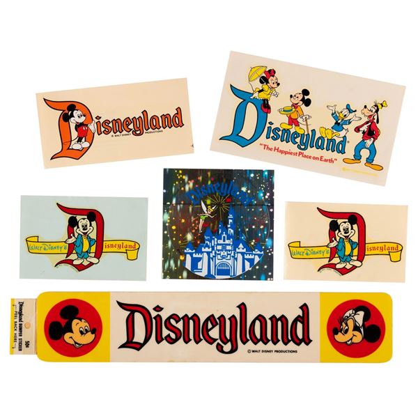 (Disneyland, 1960s-90s) A collection of four decals and two sticker souvenirs of Disneyland. Measuring from 3" x 4.75" up to the 2.75"...