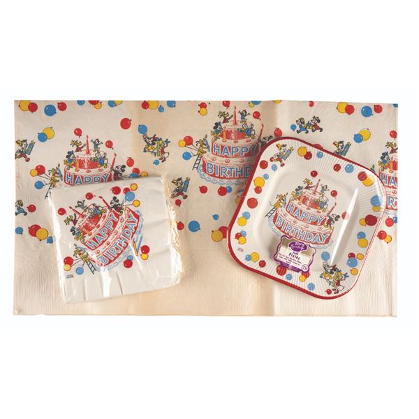 (Disney, 1950s-1960s) A vintage set of Disney birthday party supplies including paper plates, napkins, and a paper tablecloth. The 8.5" x 8.5&q...