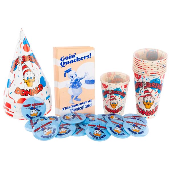 (Disneyland, 1984) A collection of Donald Duck's 50th birthday souvenirs. Included are ten identical "Goin' Quackers" pamphlets, s...