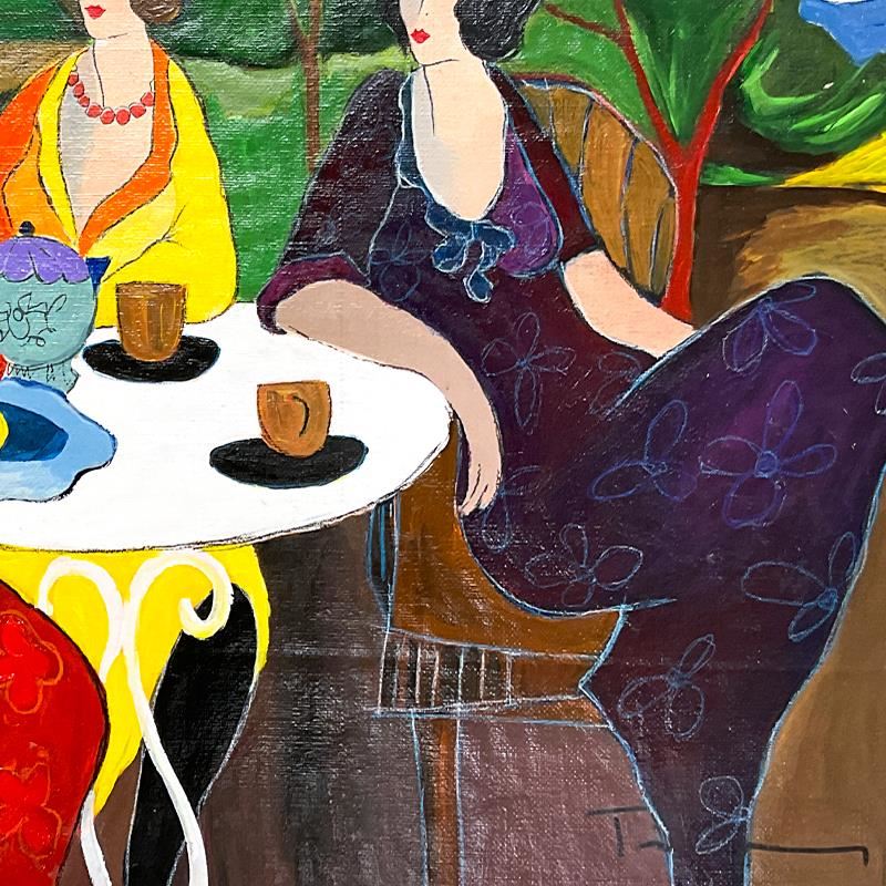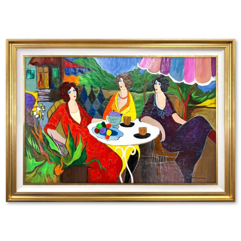 "Spring Afternoon" is a one-of-a-kind mixed media over paint by Itzchak Tarkay (1935-2012), hand signed by the artist. This piece comes custom framed. Includes Certificate of Authenticity. Measures approx. 32" x 44" (frame), 24" x 36" (image).