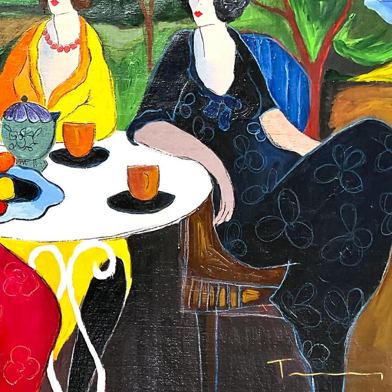 "Spring Afternoon" is a one-of-a-kind mixed media over paint by Itzchak Tarkay (1935-2012), hand signed by the artist. This piece comes custom framed. Includes Certificate of Authenticity. Measures approx. 32" x 44" (frame), 24" x 36" (image). This item requires special handling and may have a longer than usual turnaround.