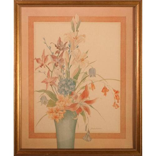 ?Spring Arrangement? is just that, a bouquet of spring flowers consisting of lilies, tulips, hydrangea, and some pussy willows to name a few. This print, a tremendous reproduction of a watercolor done by the prolific artist Gloria Eriksen, is a lovely spray of flowers done in a complementary color palette, which is aesthetically pleasing to the eye. The colors are subtle and soft, which is very fitting for this flower arrangement since it has been rendered in a similar fashion. Everything has been done with a delicate hand and a superior eye for detail, which makes this print truly ...