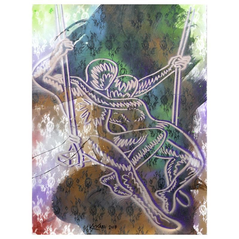 "Spring Break" is a mixed media original painting on paper, by Mark Kostabi. The piece is hand signed and comes with a certificate of authenticity. Measures approximately 30" x 22.5".