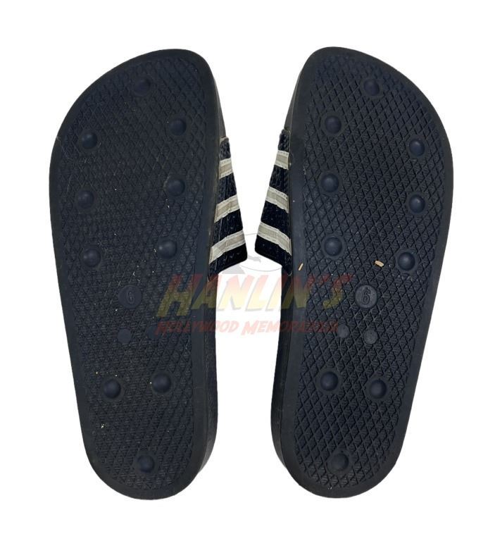 Original pair of flip-flops worn by "Cotty", played by Rachel Korine in the Harmony Korine directed black comedy crime film 'Spring Breakers' (2012), starring James Franco, Vanessa Hudgens, Selena Gomez, Ashley Benson and Rachel Korine. Gomez, Hudgens, Benson and Korine portray four college-aged girls on their spring break in Florida where they meet an eccentric local drug dealer (Franco) who helps them in a time of desperation, and their eventual descent into a world of drugs, crime, and violence.