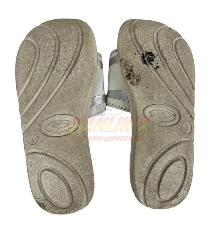 Original pair of flip-flops worn by "Cotty", played by Rachel Korine in the Harmony Korine directed black comedy crime film 'Spring Breakers' (2012), starring James Franco, Vanessa Hudgens, Selena Gomez, Ashley Benson and Rachel Korine. Gomez, Hudgens, Benson and Korine portray four college-aged girls on their spring break in Florida where they meet an eccentric local drug dealer (Franco) who helps them in a time of desperation, and their eventual descent into a world of drugs, crime, and violence.