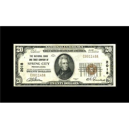 <B>Spring City, PA</B></I> - $20 1929 Ty. 1 <B>The NB & TC</B></I> Ch. # 2018<BR>This was the only bank to issue in this Chester County locale and bears the second of two titles under which it printed notes. It is an especially nice <B>Extremely Fine,</B></I> bordering on AU.