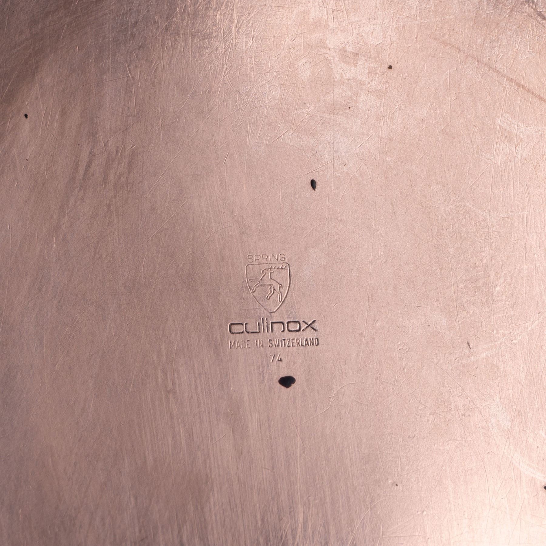 Lovely pan with a copper layer to ensure a quick and even heat distribution right to the edge of the pan which saves time, energy and heat. Spring Culinox backstamp.