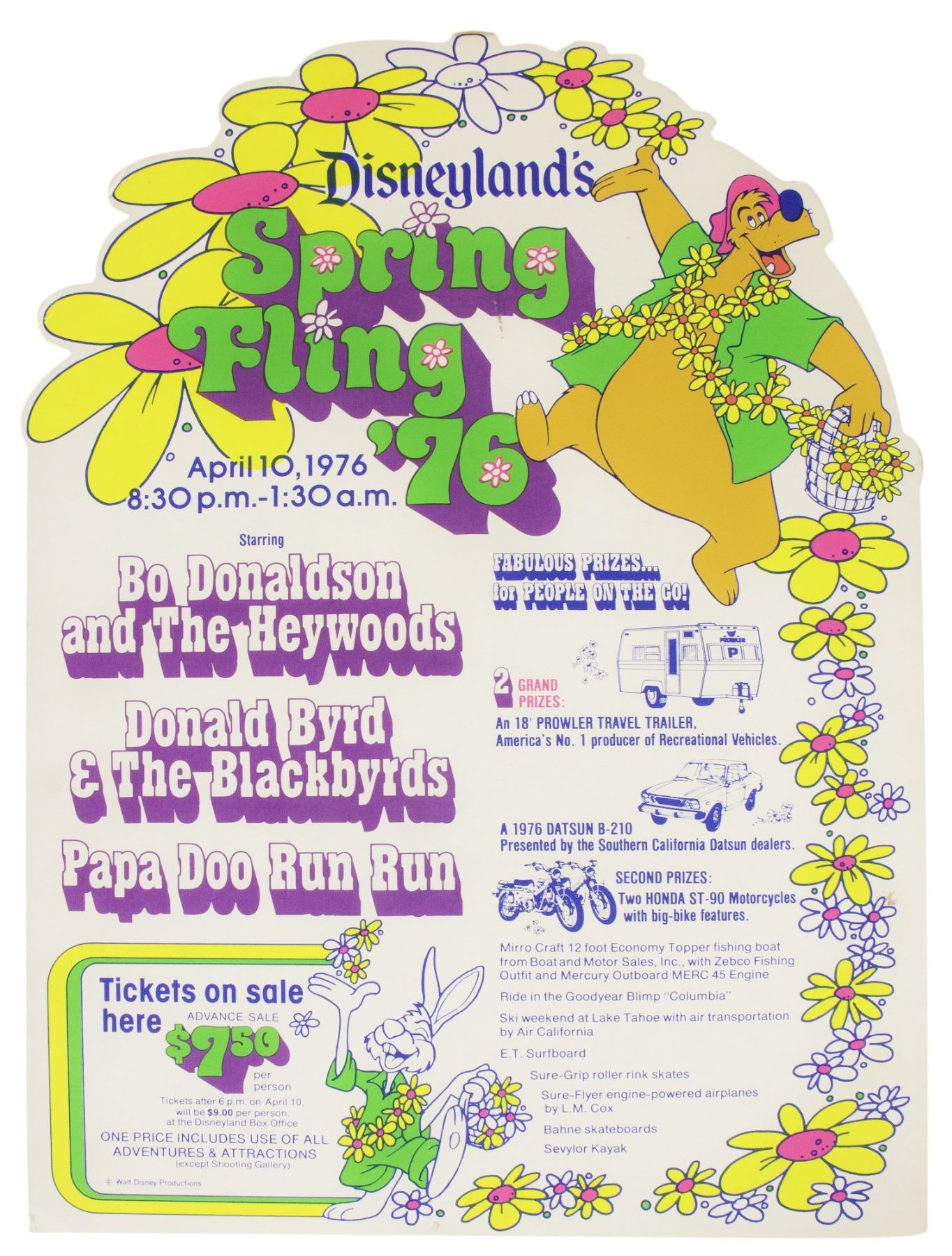 (Disneyland, 1976) A counter display for Disneyland's "Spring Fling '76". The event offered nighttime musical entertainment, car and motorcycle prizes, and more. The display is on sturdy board with a foldable stand attached to the back. This display measures 15"x11" and is in very good condition with minor wear from use.