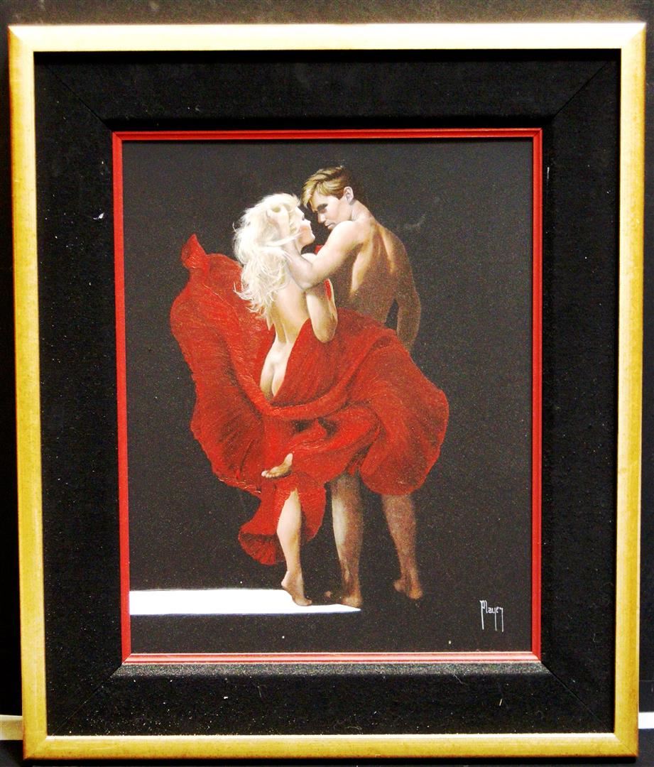 A beautiful young woman's bright red dress partially covers herself and her lover as they prepare for a passionate embrace in David Player's oil on board. The painting measures 20 x 16; framed image measures approx. 32 x 28.