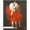 A beautiful young woman's bright red dress partially covers herself and her lover as they prepare for a passionate embrace in David Player's oil on board. The painting measures 20 x 16; framed image measures approx. 32 x 28.
