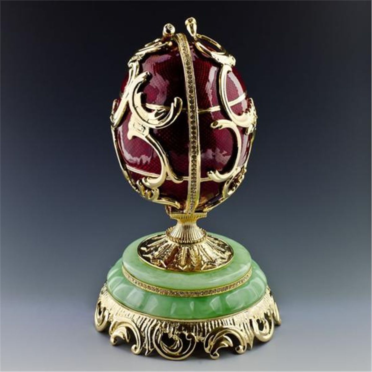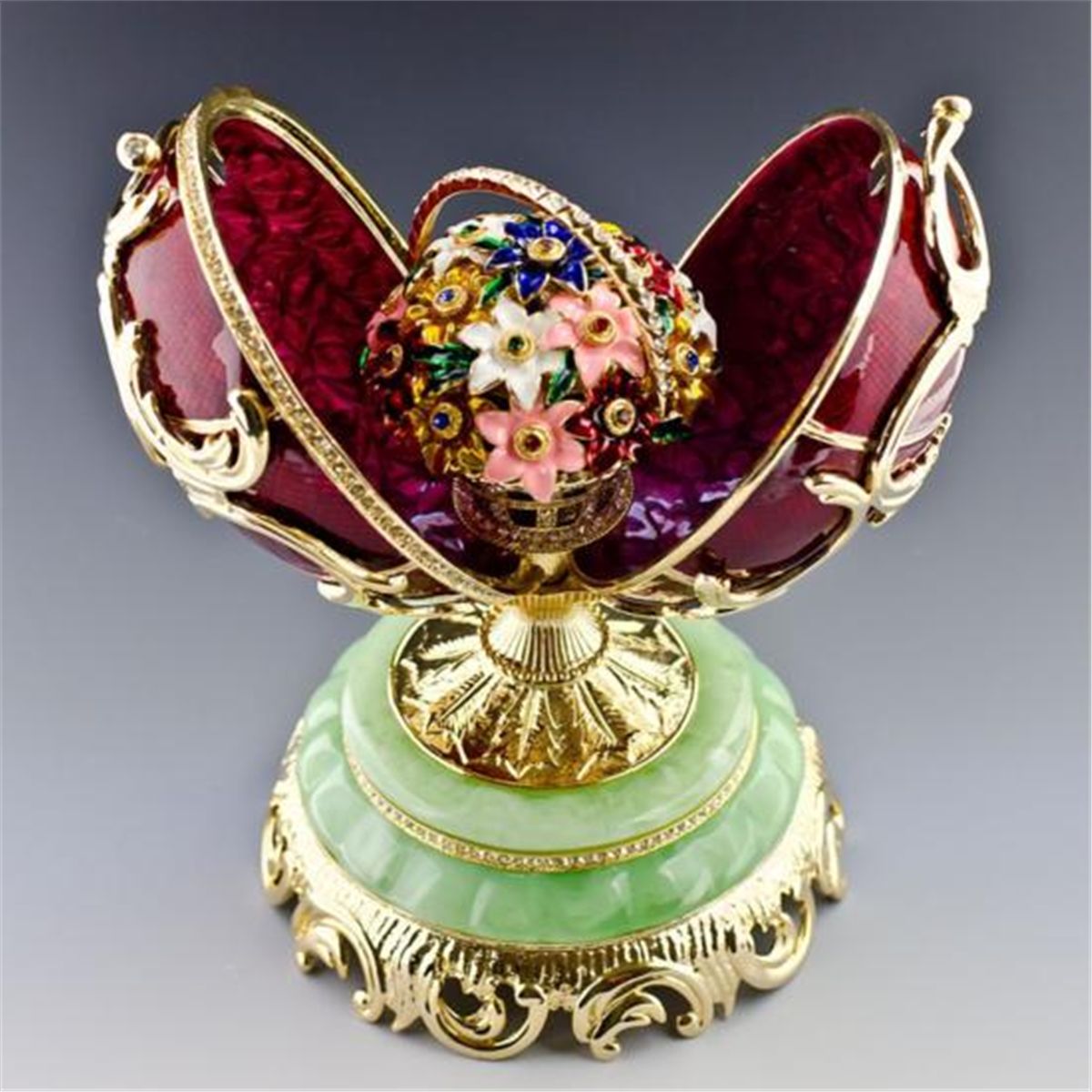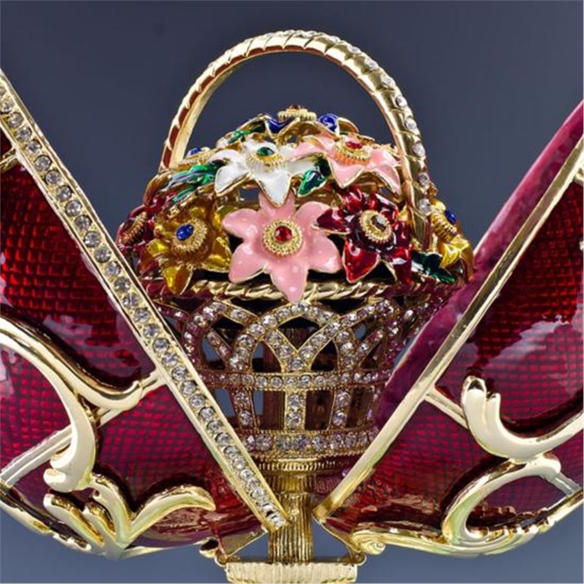 Spring Flowers Faberge Egg, Dimensions: 9in (H) X 3.75in (W), Egg Weight: 4 lbs 6 oz (2 kg), Material: Pewter, Enamel, Crystals, Egg Contains Music Box and Plays ~For Elise~ by V. Beethoven. The famed Faberge eggs are jeweled eggs, often with the most ornate, minuscule designs on them. The House of Faberge made the original pieces from 1885 to 1917. At that time, they became popular gifts given during the Easter season. Larger versions were made for the Russian royal family, including Alexander III and Nicolas II. Of these, 42 of the 50 originals exist today. Most Faberge eggs, though, were much smaller and hung from a chain around the neck. These eggs have precious metals on them or gemstone decorations, often with intricate detailing. These are a symbol of luxury and thought of as individual masterpieces.