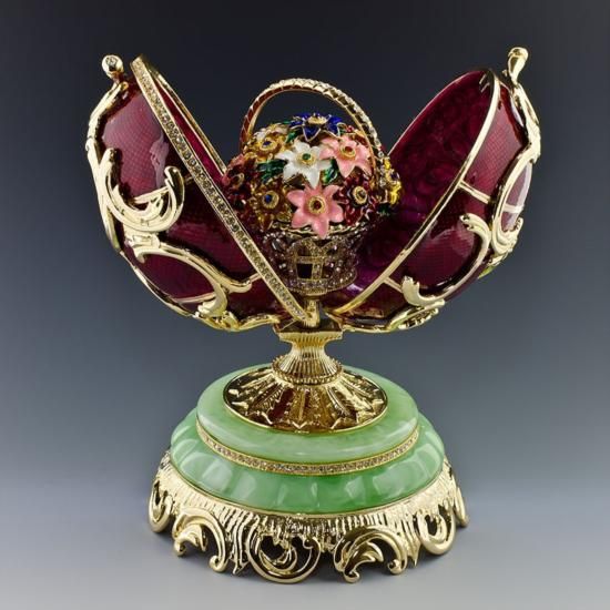 Spring Flowers Faberge Egg, Dimensions: 9in (H) X 3.75in (W), Egg Weight: 4 lbs 6 oz (2 kg), Material: Pewter, Enamel, Crystals, Egg Contains Music Box and Plays ~For Elise~ by V. Beethoven. The famed Faberge eggs are jeweled eggs, often with the most ornate, minuscule designs on them. The House of Faberge made the original pieces from 1885 to 1917. At that time, they became popular gifts given during the Easter season. Larger versions were made for the Russian royal family, including Alexander III and Nicolas II. Of these, 42 of the 50 originals exist today. Most Faberge eggs, though, were much smaller and hung from a chain around the neck. These eggs have precious metals on them or gemstone decorations, often with intricate detailing. These are a symbol of luxury and thought of as individual masterpieces.