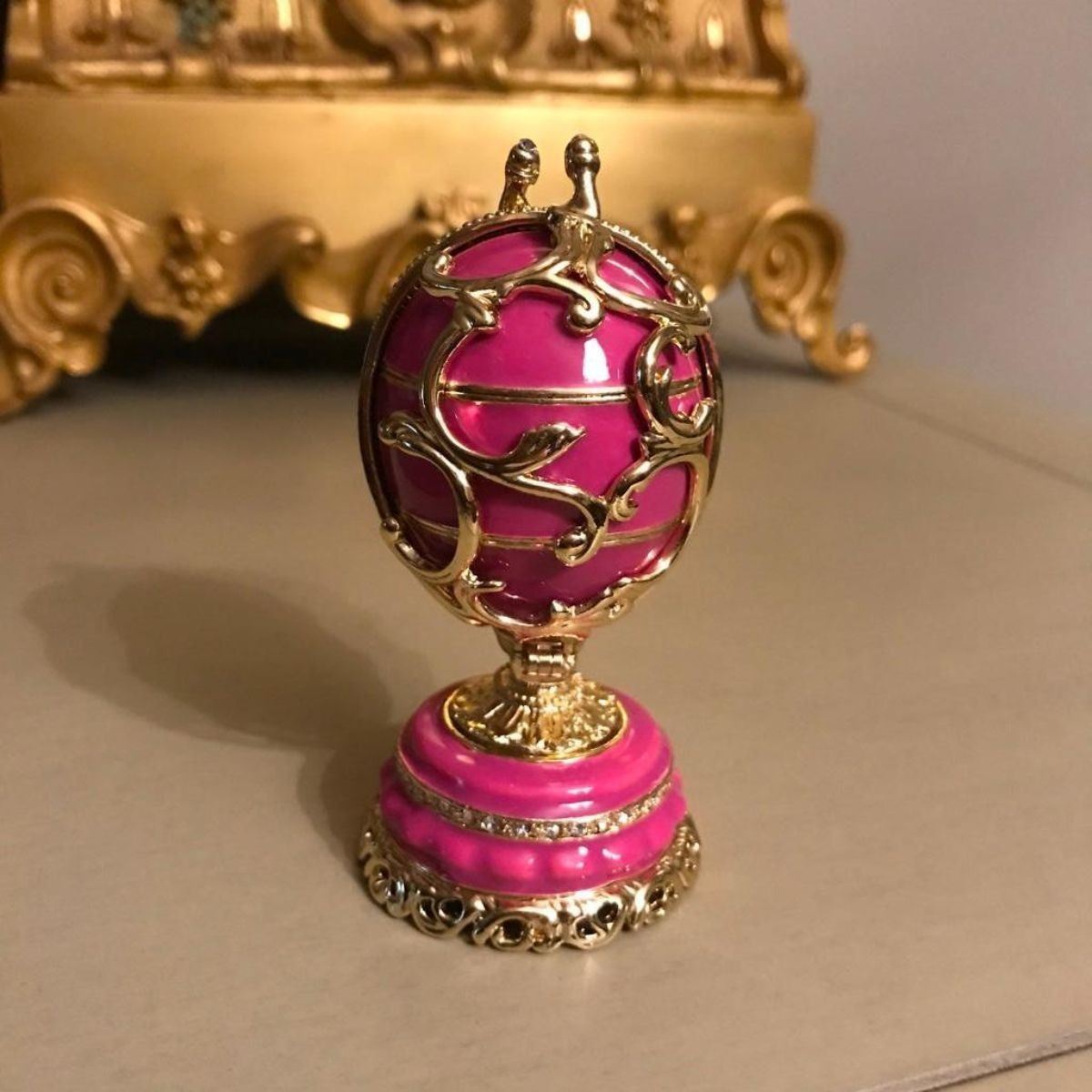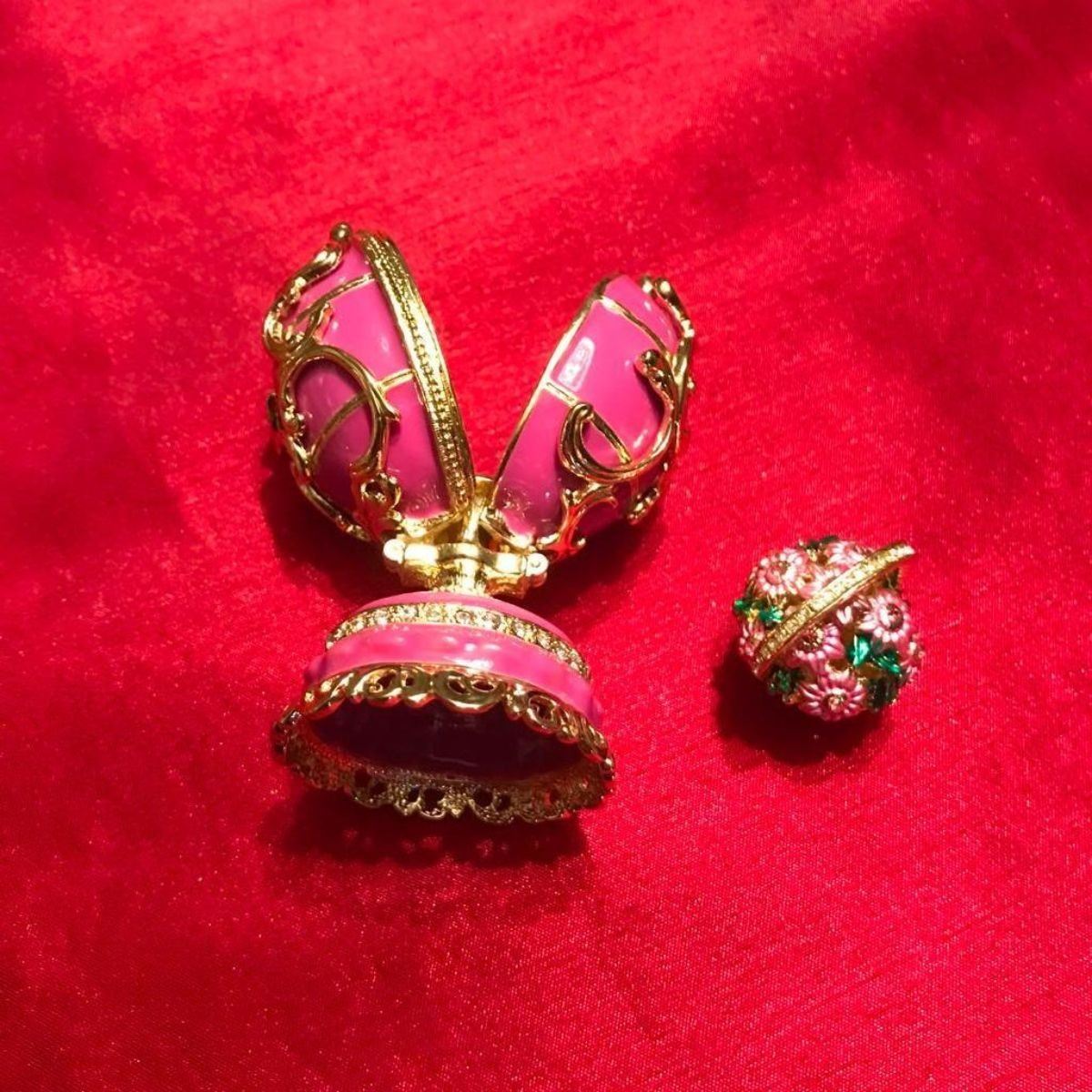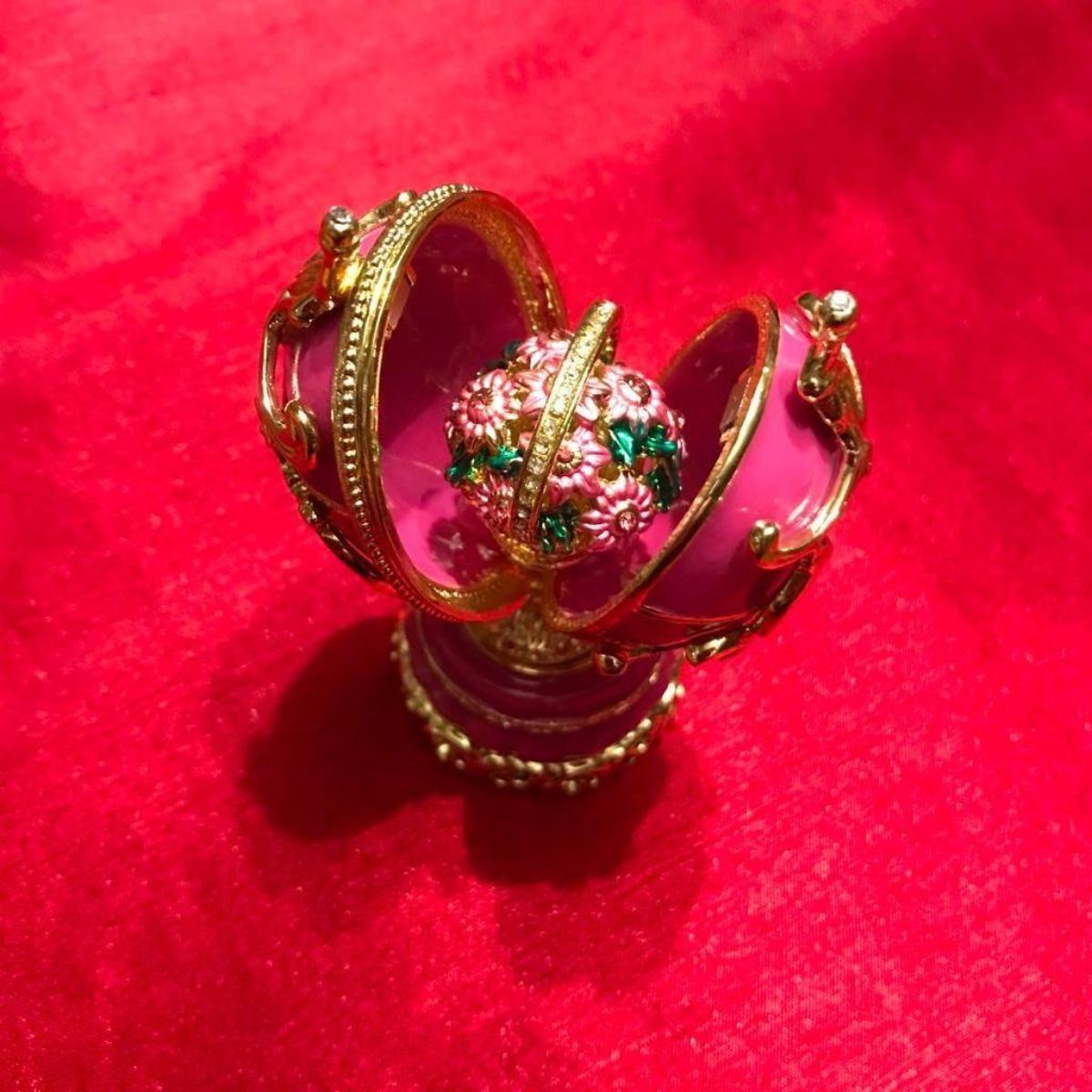 Russian Faberge inspired decorative egg, jewel, trinket box. Hand-painted enamel over pewter & gilt with embedded Austrian crystals in a Spring Flowers theme. The Egg splits in the center on a hinge to reveal a hidden compartment for jewels or trinkets, with magnetic closure. Inside is a tiny removable basket enamel & pewter basket of Springtime flowers that will stay in place with a magnet. 3 1/2" H X 1 3/4" D. Comes with gift box.