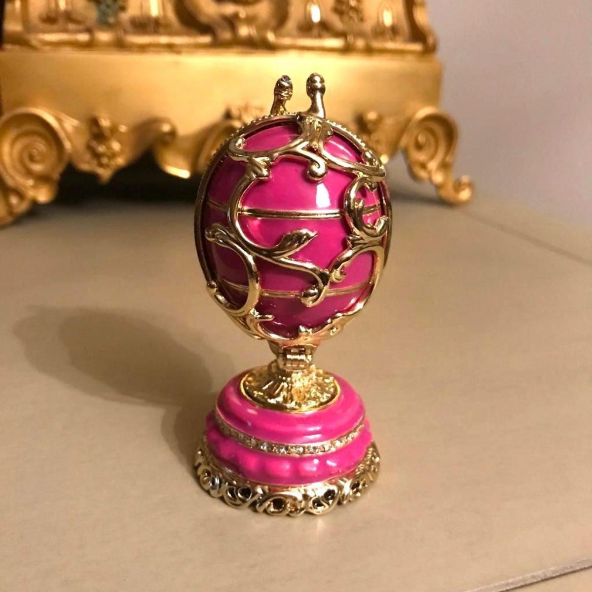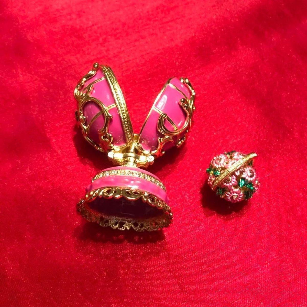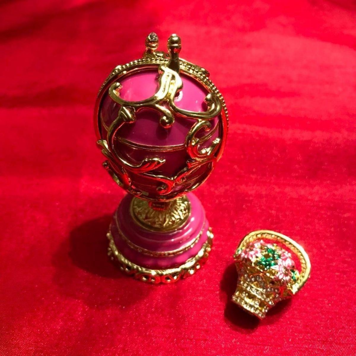 Russian Faberge inspired decorative egg, jewel, trinket box. Hand-painted enamel over pewter & gilt with embedded Austrian crystals in a Spring Flowers theme. The Egg splits in the center on a hinge to reveal a hidden compartment for jewels or trinkets, with magnetic closure. Inside is a tiny removable basket enamel & pewter basket of Springtime flowers that will stay in place with a magnet. 3 1/2" H X 1 3/4" D. Comes with gift box.