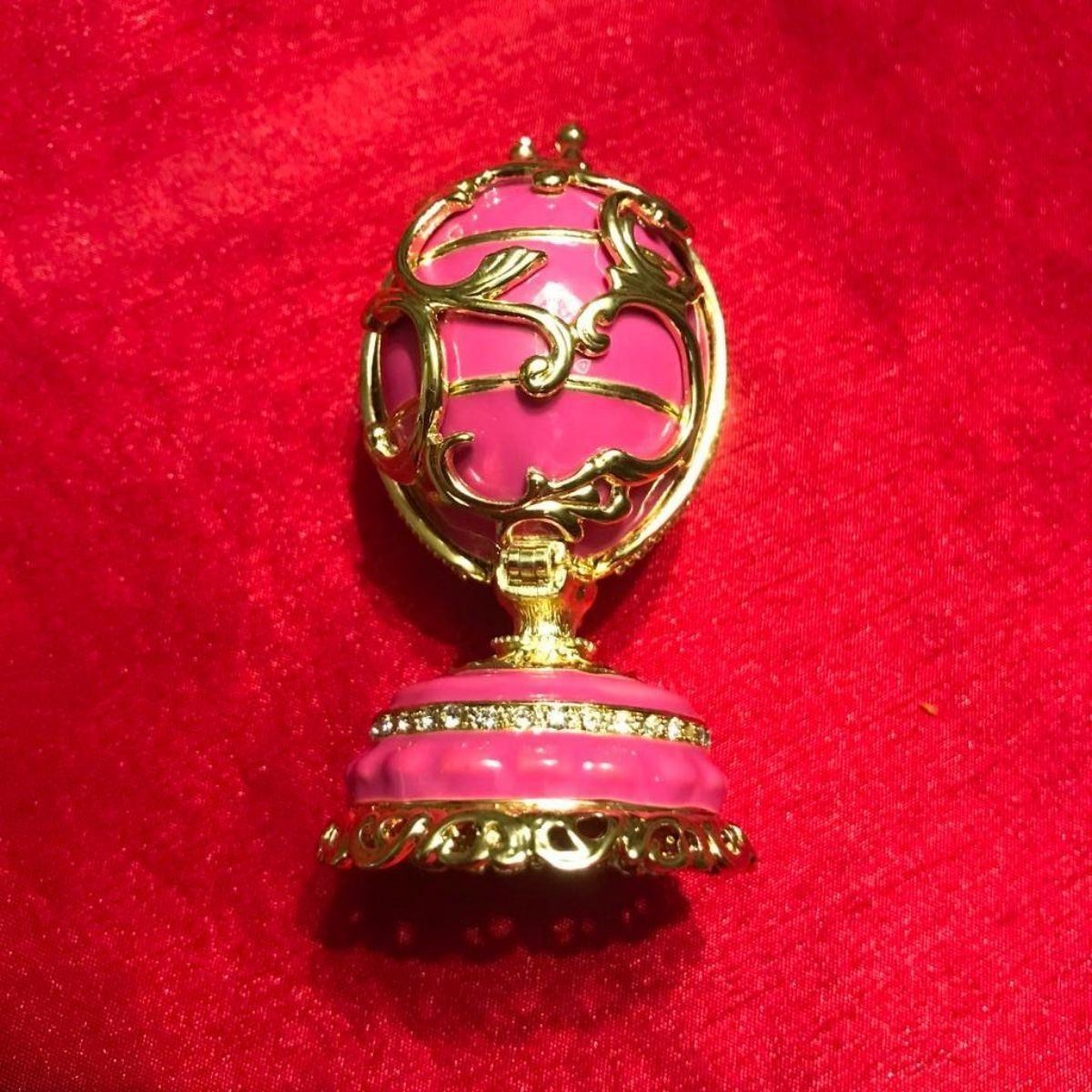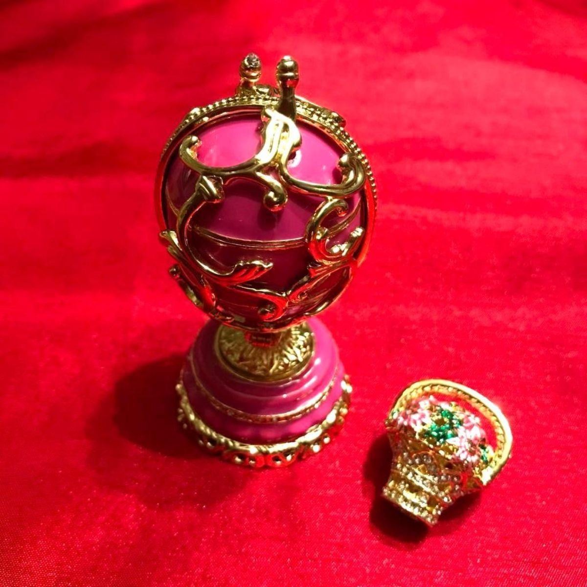 Russian Faberge inspired decorative egg, jewel, trinket box. Hand-painted enamel over pewter & gilt with embedded Austrian crystals in a Spring Flowers theme. The Egg splits in the center on a hinge to reveal a hidden compartment for jewels or trinkets, with magnetic closure. Inside is a tiny removable basket enamel & pewter basket of Springtime flowers that will stay in place with a magnet. 3 1/2" H X 1 3/4" D. Comes with gift box.