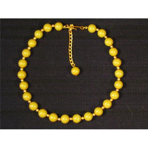 A short string of bakelite beads in a lovely spring green with small round goldtone spacers, witha 3 inch goldtone link extension finished with a green bead, hook clasp. Length: 12 1/2 in.