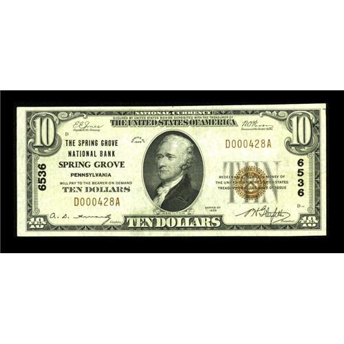 <B>Spring Grove, PA</B></I> - $10 1929 Ty. 1 <B>The Spring Grove NB</B></I> Ch. # 6536<BR>A high grade small example from this well collected York County location. Bright <B>Very Fine+++.</B></I><BR><BR><b>Shipping:</b> Coins & Currency (<a target="_blank" href="http://www.heritageauctions.com/common/shipping.php">view shipping information</a>)