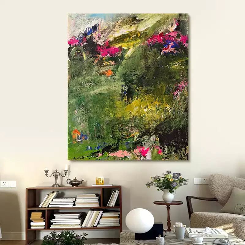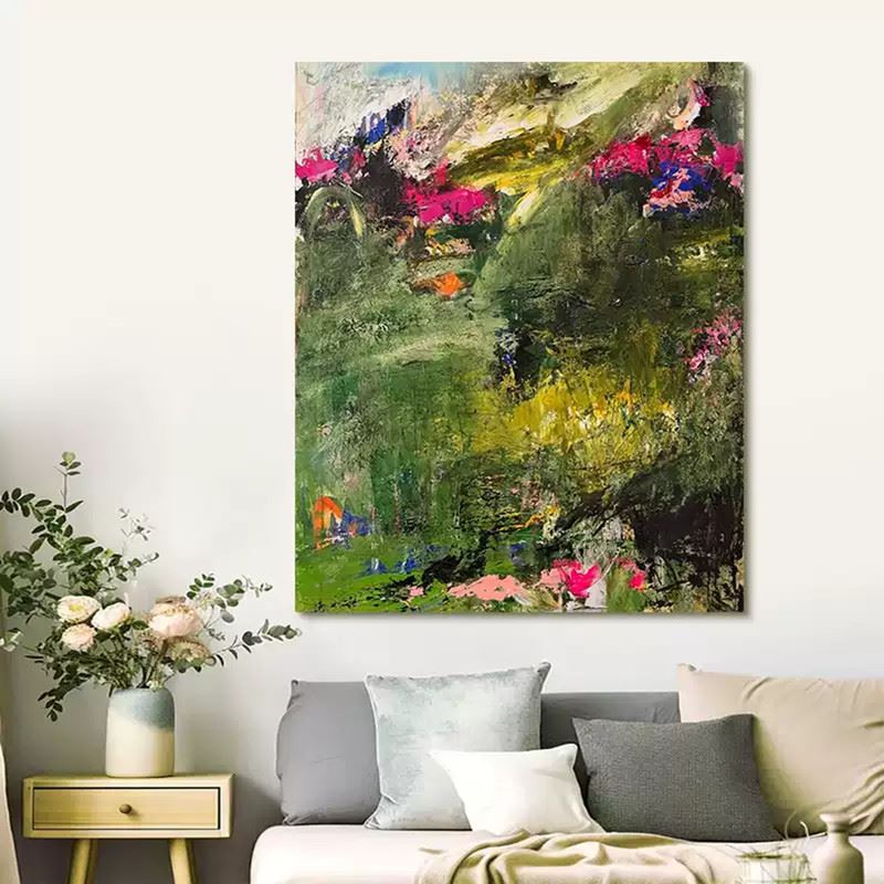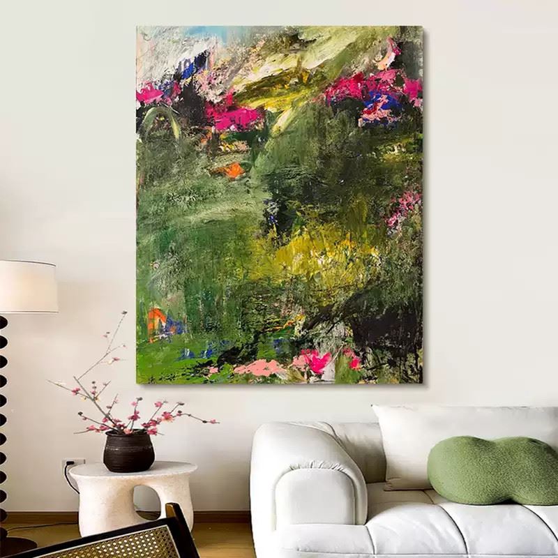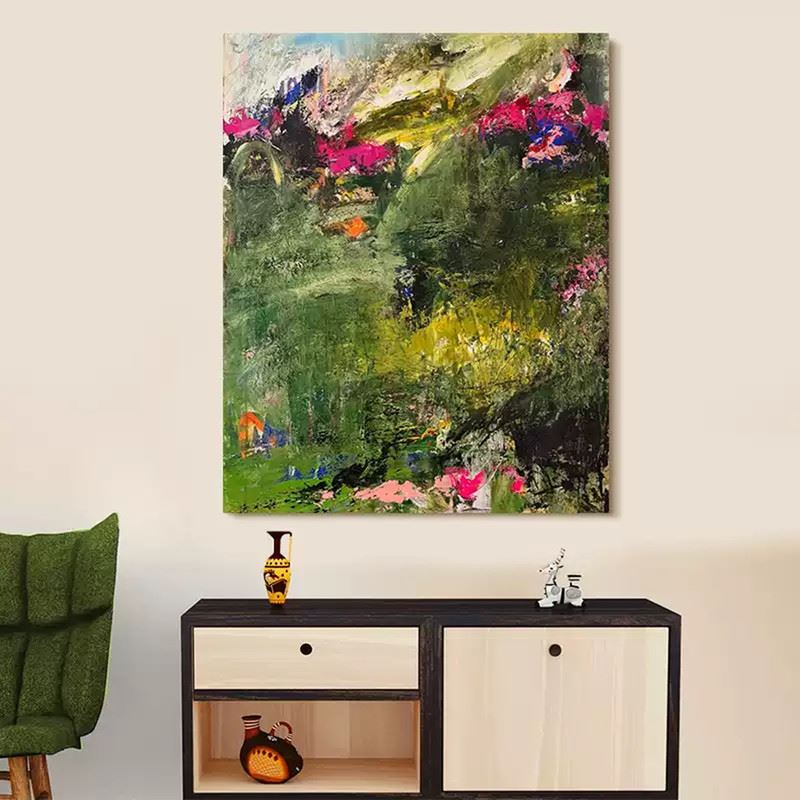 This artwork uses vibrant greens and pinks to showcase the vitality and colors of a spring meadow. The bold color blocks and dynamic brushstrokes convey the powerful renewal of nature, as the essence of spring bursts forth in the canvas, bringing a sense of vitality and hope. Dimensions: 24 x 31 inches.