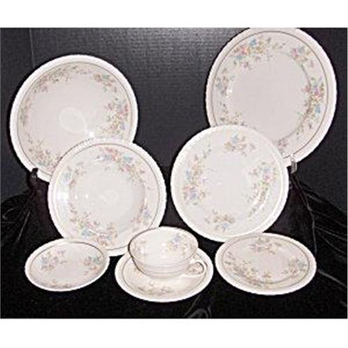 This dainty set with its pink and blue flowers is Spring Time by Hanover, from an older estate and in beautiful condition. It is missing one dinner plate and has a creamer & sugar bowl w/lid that are not shown in the picture. There are three dinner plates, four each of cups, saucers, desserts, bread & butter plates, salad plates, soup bowls, one each creamer, sugar w/lid, gravy boat w/ attached under plate and round open vegetable bowl.