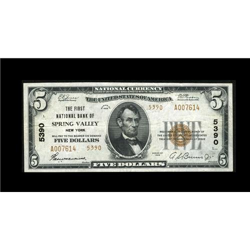 <B>Spring Valley, NY</B></I> - $5 1929 Ty. 2 <B>The First NB</B></I> Ch. # 5390<BR>This example comes from the sole bank to issue in this avidly collected Rockland County community. Just one large example has been recorded in the census from here, forcing collectors to seek an example from the dozen Series 1929 specimens reported to date. Pleasing <B>Very Fine+.</B></I>