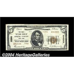 Spring Valley, NY - $5 1929 Ty. 2 The First NB Ch. # 5390A very unusual bank which issued large size and Type 1 small size notes along with a fair number of Type 2 examples. Even counting the three pieces we sold last year, the census from here is still under ten small notes (along with one large example), not at all enough for the many collectors of Rockland County material. Nice Very Fine. <BR><BR><B>Important notice:</B> Heritage usually auctions material at the rate of 200-250 lots per hour. On some occasions eBay Live bid software or the Internet may not be able to keep up with the pace of the auction. We recommend placing a realistic absentee bid now as insurance to avoid disappointment. Occasionally the auctioneer may eliminate or reject an eBay Live bid, and the auctioneer may also reopen a lot after the close of the eBay live bidding (usually because we missed an audience bid), and may reject your bid even if it shows you as the winning bidder. By bidding via eBay Live, you agree that Heritage may award the lot to another bidder at its sole discretion under the circumstances described above or any other reasonable circumstances. Since eBay bids are not shown to us until we open the lot on the floor, we treat those bids just like floor bids. In most cases the floor responds before the eBay bid is presented to us, due to Internet lag time, so for consistency we have made it a policy that floor bids are always considered first over tie eBay live bids. Also please note that all Heritage lots purchased through eBay Live carry a 20% Buyer's Premium. Please make sure you read the Terms and Conditions before you bid. <BR><BR><B>IMPORTANT ANNOUNCEMENT ABOUT RESERVES:</B> Heritage now divulges all reserves on its web site 7 days before every auction. If you want to know whether the reserve on this lot has been met, and if not, what the reserve amount is, please visit this lot page on the HeritageCoin.com web site, or email: bid@HeritageGalleries.com
