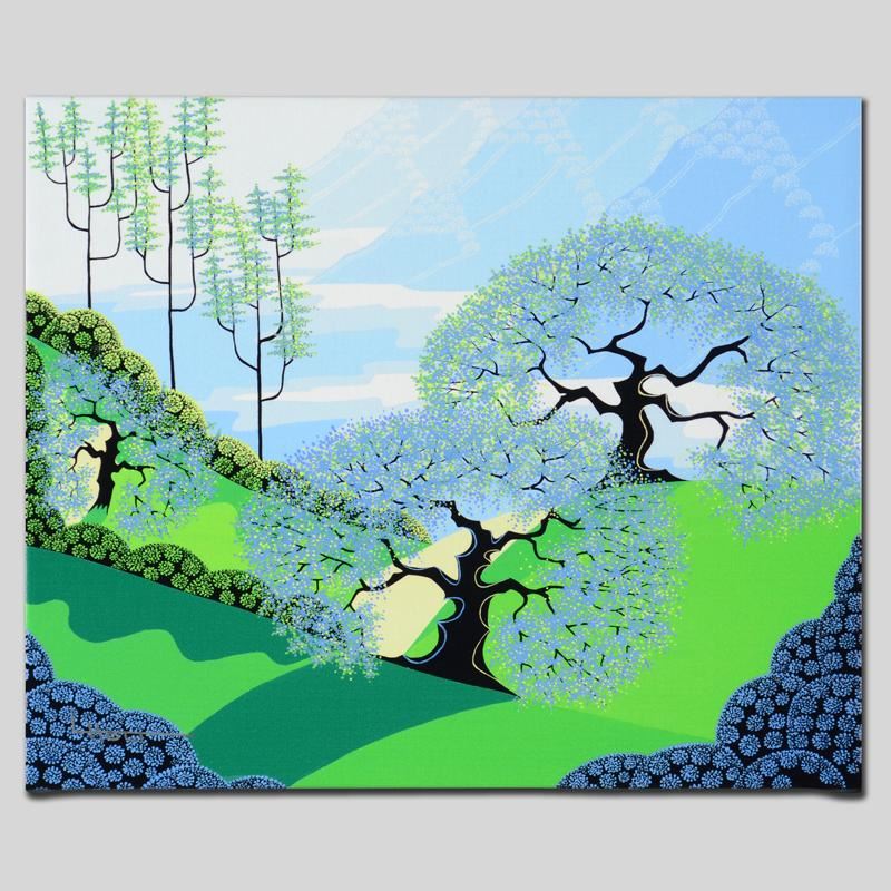Larissa Holt, a student of distinguished artist Eyvind Earle(1916-2000), uses bold colors and breathtaking scenery to create images of Nature in her own unique style. "Spring" is a limited edition giclee on stretched canvas by Holt, numbered and bearing Holt's authorized signature. This piece comes gallery wrapped with a black border, and is ready to hang. Includes Certificate of Authenticity! Measures approx. 12" x 10" x 1.5" (image).