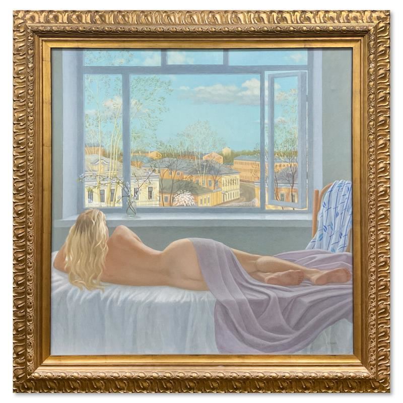 "Spring" is an original oil painting on canvas by Eugeny Senin, hand signed by the artist. This piece comes framed. Includes Letter of Authenticity. Measures approx. 48.5" x 48.5" (frame), 38.5" x 38.5" (image). There is some where on the frame.