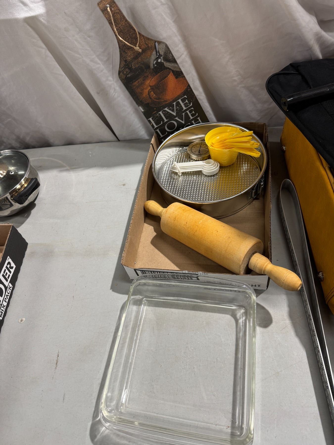 Spring pan, baking dish, rolling pan, measuring cups teaspoons thermometer