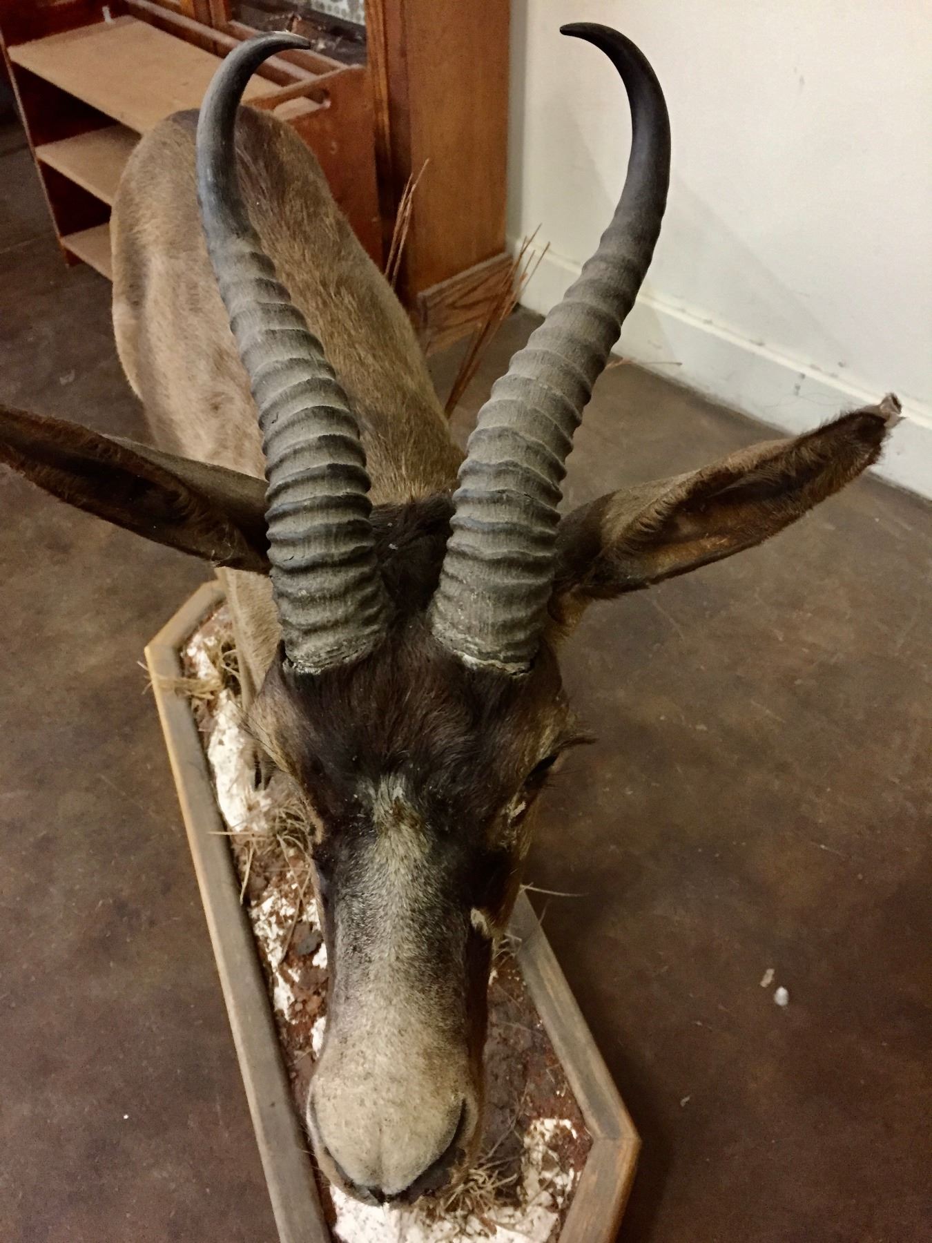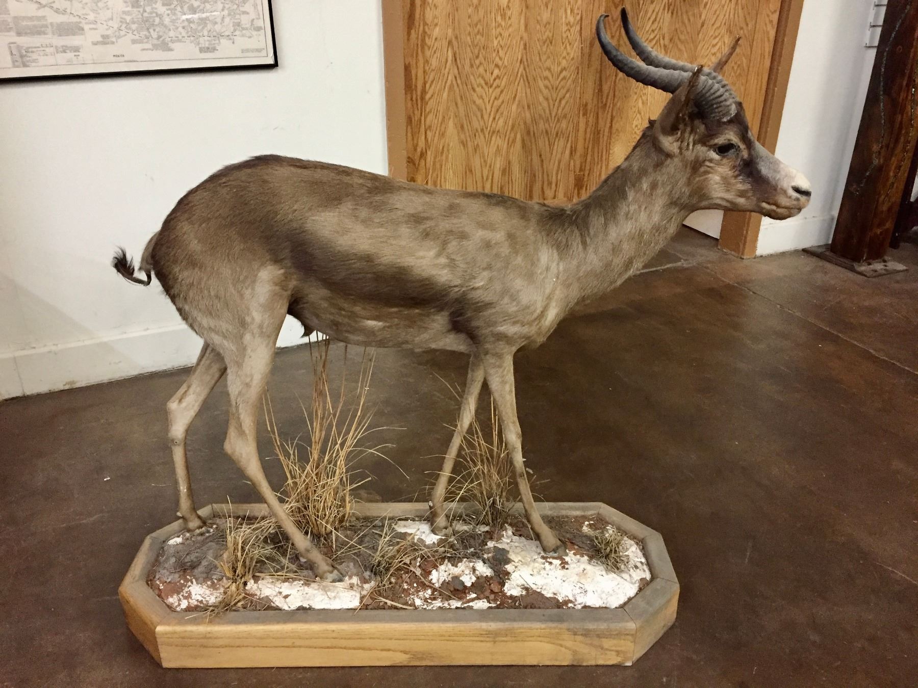 Description: For sale in this lot is a full body taxidermy Springbok mount with base. Maker: Unknown taxidermist. Approx. Age: Vintage, but not super old. Size: Measures 45” l x 44” tall x 14 1/2” w, base included. Condition: Missing some hair and foliage at the base, but pretty good for its age. Please look closely at the pictures - they are an important part of our description. Shipping: There will be NO for shipping this lot. Local pickup only.