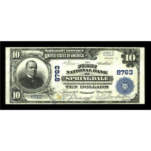 <B>Springdale, AR</B></I> - $10 1902 Plain Back Fr. 626 <B>The First NB</B></I> Ch. # 8763<BR>The signatures are printed nicely on this example. A Plain Back $10 on this bank in the same grade went for almost $2400 in September 2005. <B>Very Fine.</B></I><BR><BR><b>Shipping:</b> Coins & Currency (<a target="_blank" href="http://www.heritageauctions.com/common/shipping.php">view shipping information</a>)
