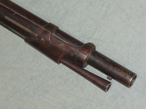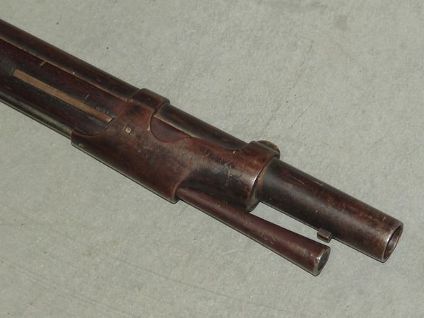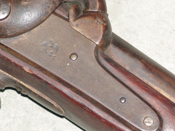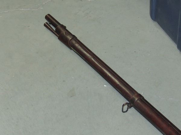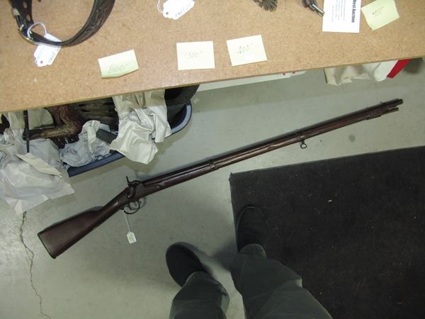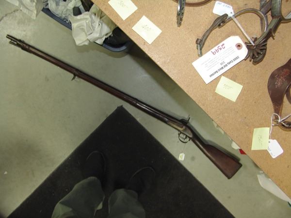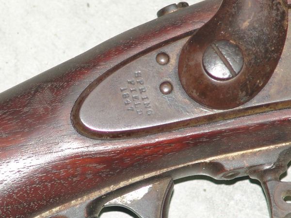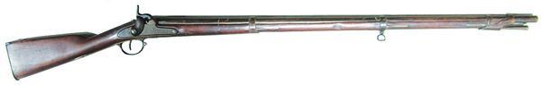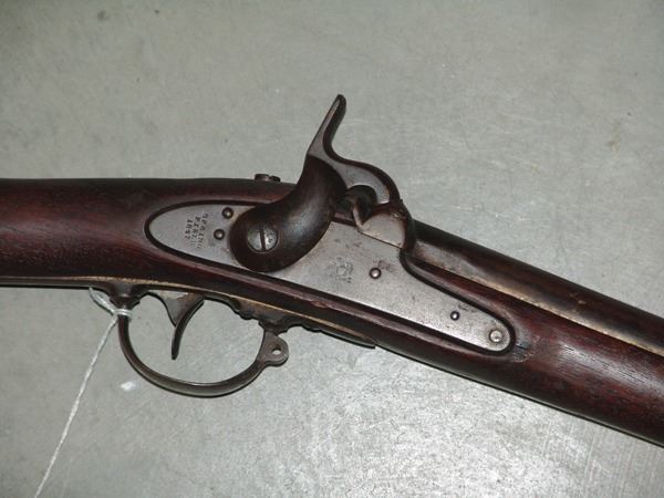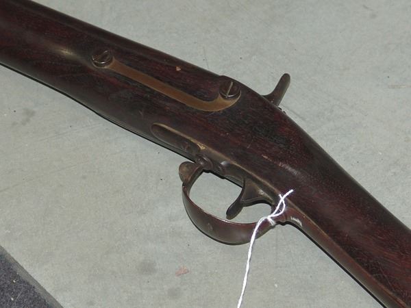 Rare, .69 cal. three band Civil War musket with bayonette lug and steel ramrod. Marked at lock plate & barrel "Springfield, US, 1847". With spread eagle, proof & inspector marks. The last smooth bore model & first model made with interchangeable parts by Springfield at Harpers Ferry. Stock marked "Ohio" No S/N