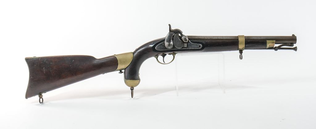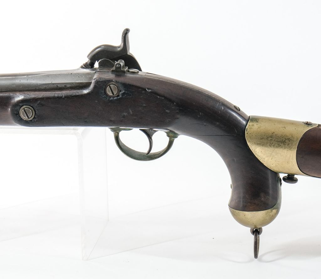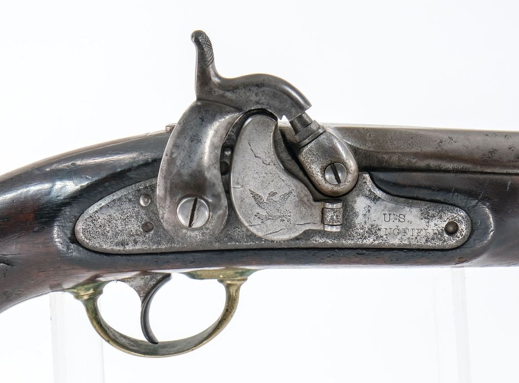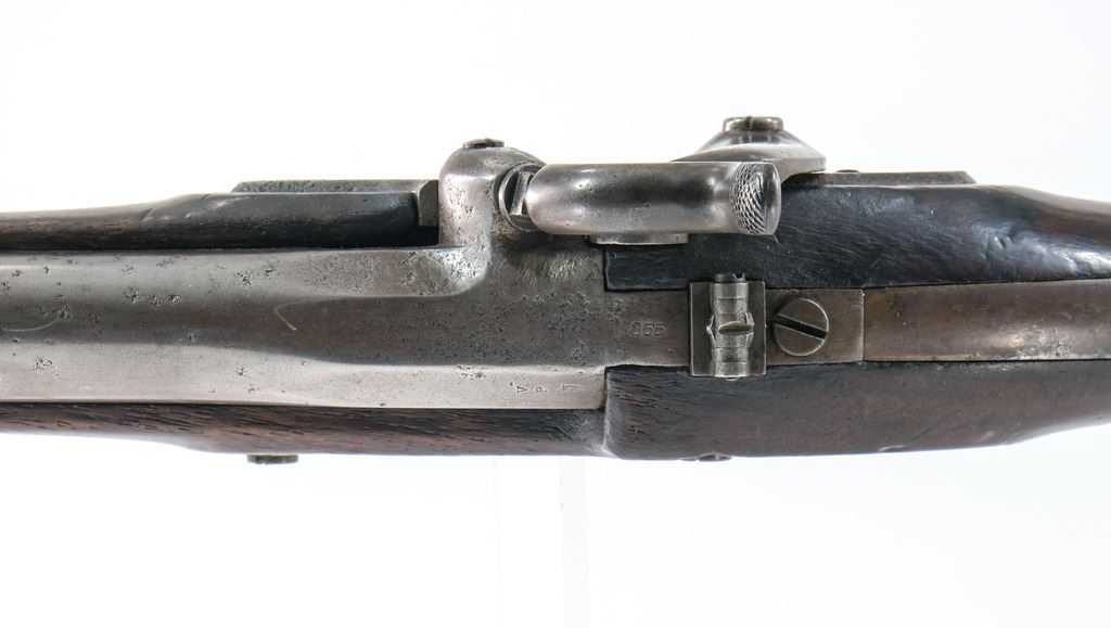 Springfield Armory U.S. model 1855 Maynard Tape Primed Pistol Carbine. This is one of approximately 4000 produced using the same Maynard priming system and 58 caliber ammunition as the 1855 musket. Instead of directly priming the nipple by hand for each shot, the user would install a roll of paper percussion caps. A single cap would be exposed, sheared and carried by the hammer to detonate on the nipple. Standard rifle percussion caps could also be used. This system was abandoned at the beginning of the Civil War. This was used as a pistol but when fitted with the rare shoulder stock, which is included, it could be used as a carbine. The lock plate is marked “U.S./SPRINGFIELD” and the Maynard system's door is engraved with the Federal Eagle. The butt plate on the removable stock is marked “US”. The left side of the barrel is marked “V”, “P” with an eagle head and dated “1855”. The condition shows use with some spots of pitting on the barrel, around the nipple and on the lock plate to the extent that only a portion of "SPRINGFIELD" is legible. The pistol grip has a surface crack on either side but is solid. There is also a crack at the forend that looks to be an old repair. The detachable stock is in nice condition with some light surface handling marks. Overall a nice excellent example of a scarce and desirable U.S. Pistol Carbine with the rare Maynard tape device worthy of any Springfield collection. Antique.