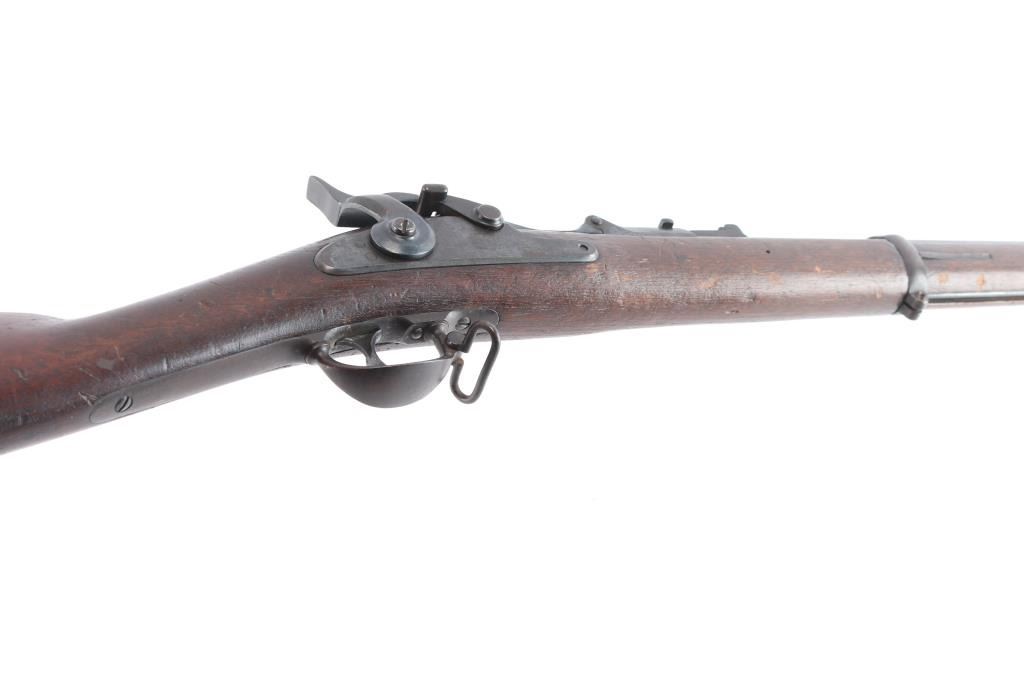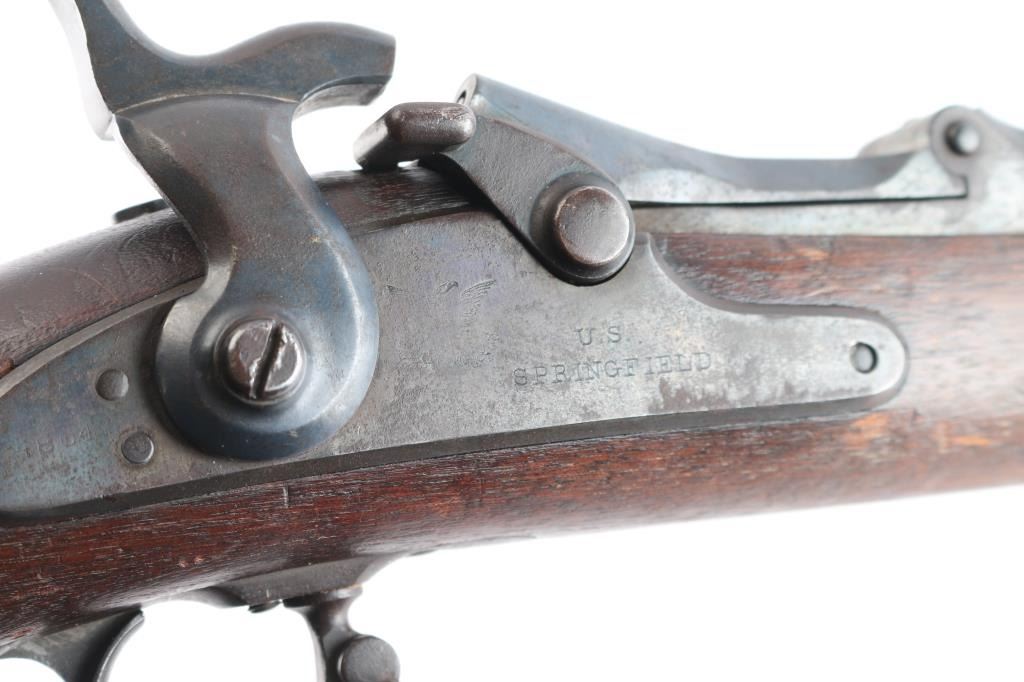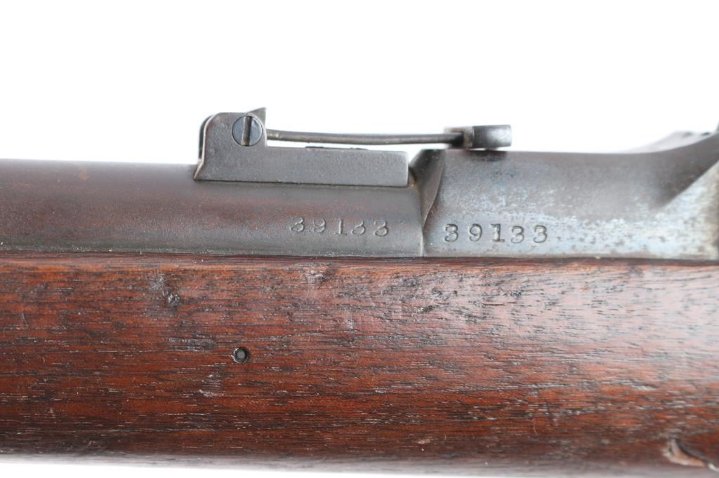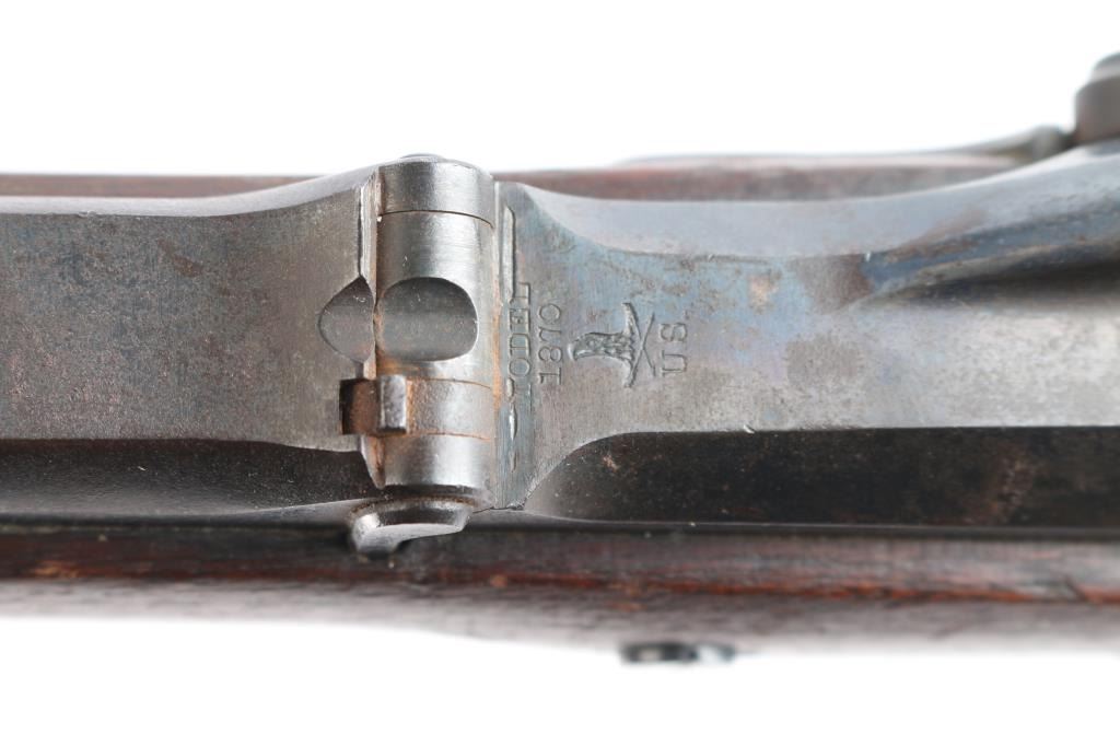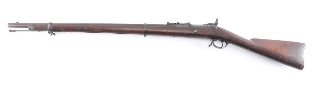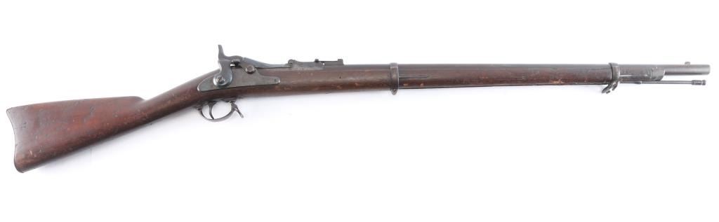 SN: 39133. U.S. Springfield Trapdoor Cadet 1863/1870 Conversion In .50-70. Single shot "Trapdoor" US military rifle. Has Model 1870 features including arched underside of breech bolt, has matching numbered barrel and receiver, as well as "Model 1870" dated breech bolt (over eagle head. crossed arrows over "US"). Blued finish, 28 2/4" barrel, blade front sight, folding elevator rear sight almost up against the receiver, sling swivels, stacking swivel, 1868 cleaning rod. "1864" dated lock plate. "U.S." stamped buttplate tang, "11" stamped in right buttstock, feint "P" in circle behind triggerguard. Bore is fair, good rifling some scattered light pitting. Metal surfaces are mostly patina brown, with some original blue finish on the receiver, breech block, hammer and lock plate. Wood is good/sound condition, with scratches and scrapes. Action is sound and the markings are clear/readable.