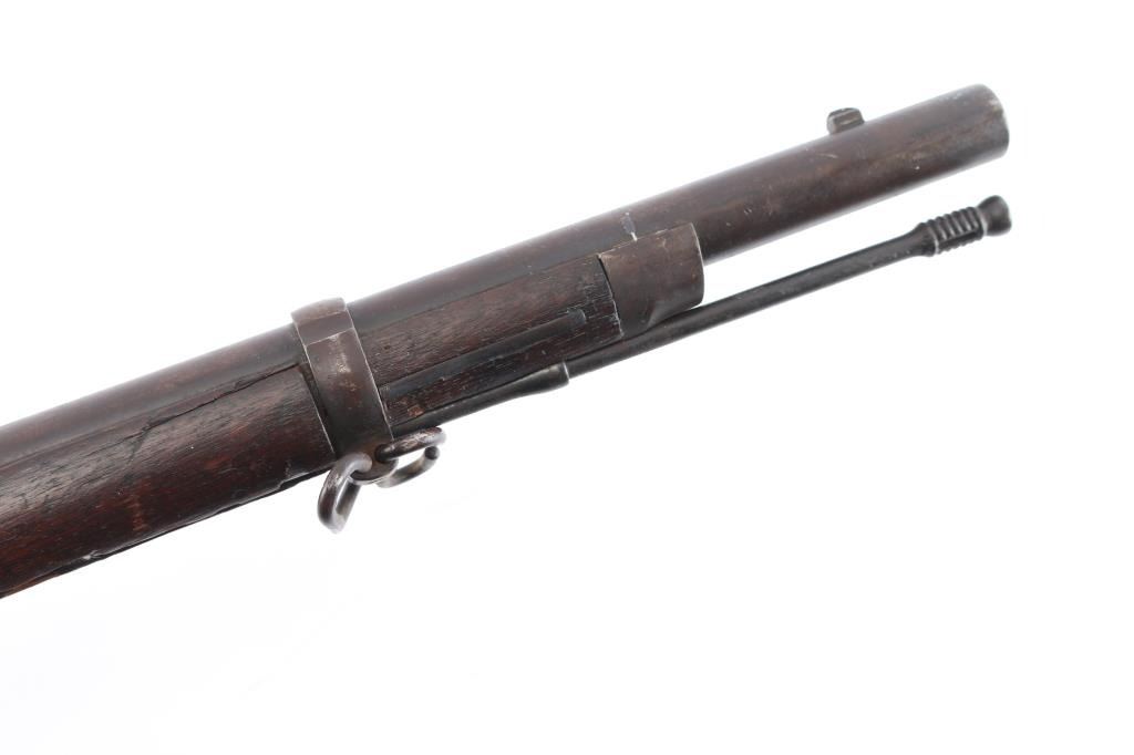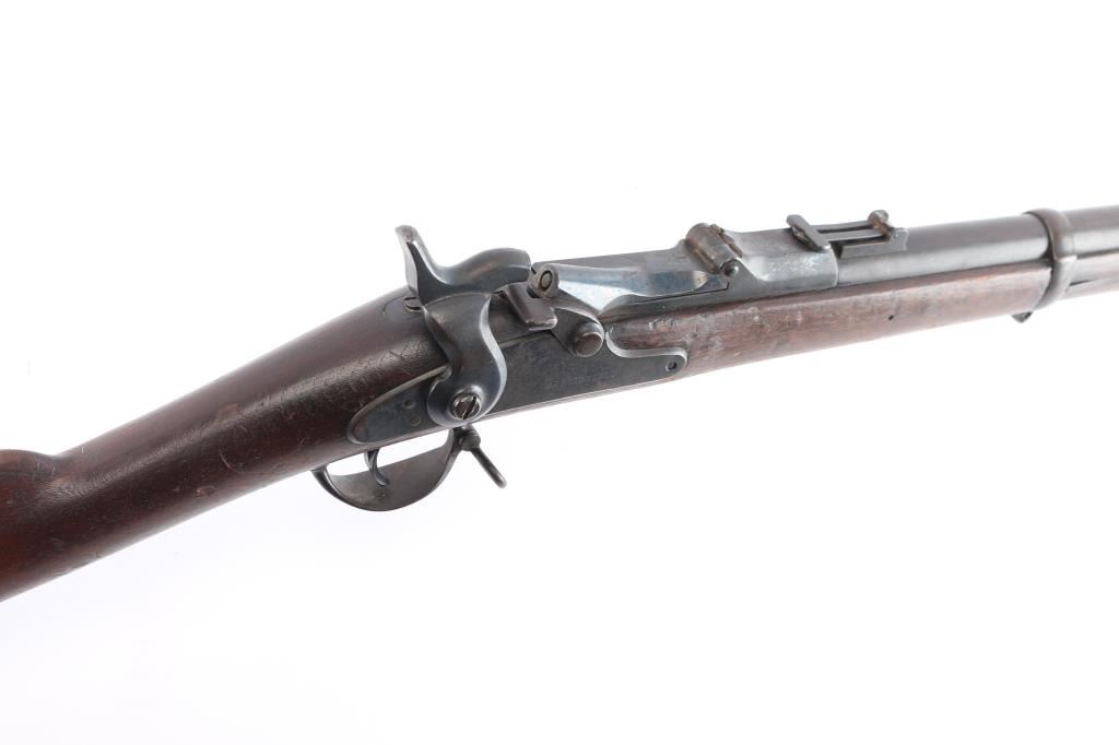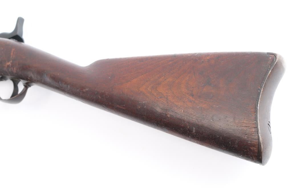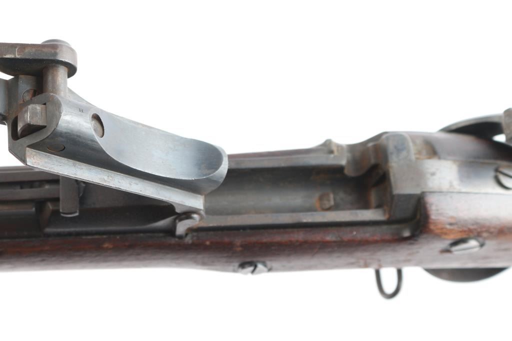 SN: 39133. U.S. Springfield Trapdoor Cadet 1863/1870 Conversion In .50-70. Single shot "Trapdoor" US military rifle. Has Model 1870 features including arched underside of breech bolt, has matching numbered barrel and receiver, as well as "Model 1870" dated breech bolt (over eagle head. crossed arrows over "US"). Blued finish, 28 2/4" barrel, blade front sight, folding elevator rear sight almost up against the receiver, sling swivels, stacking swivel, 1868 cleaning rod. "1864" dated lock plate. "U.S." stamped buttplate tang, "11" stamped in right buttstock, feint "P" in circle behind triggerguard. Bore is fair, good rifling some scattered light pitting. Metal surfaces are mostly patina brown, with some original blue finish on the receiver, breech block, hammer and lock plate. Wood is good/sound condition, with scratches and scrapes. Action is sound and the markings are clear/readable.
