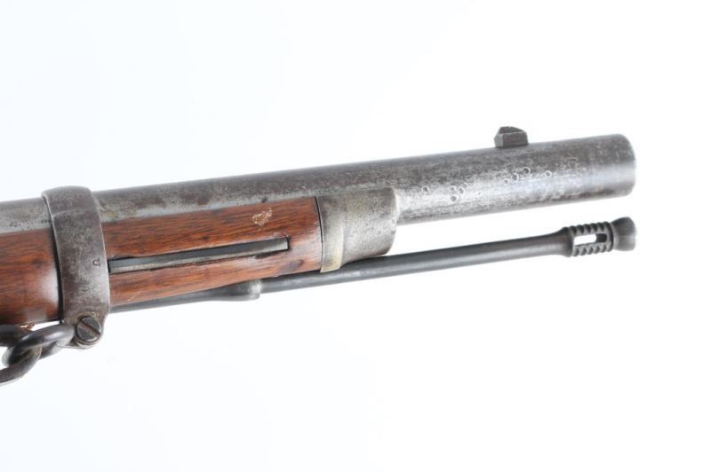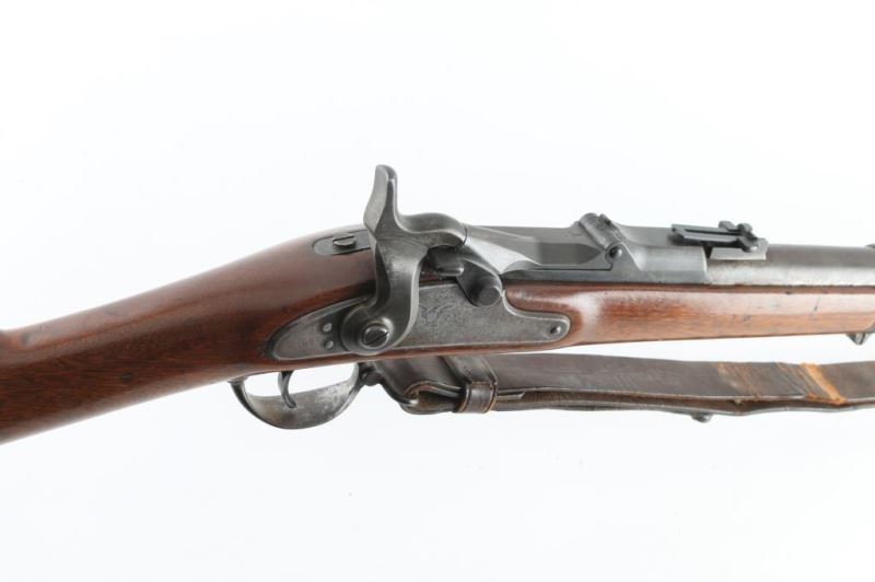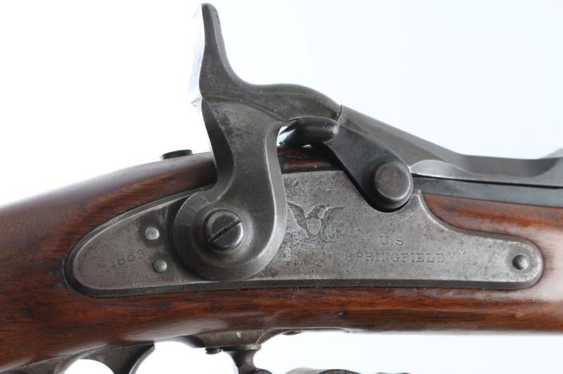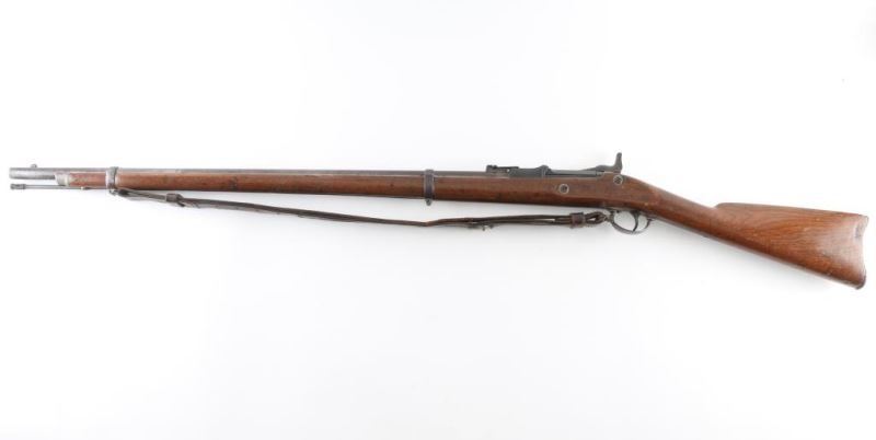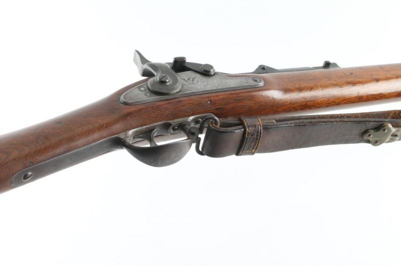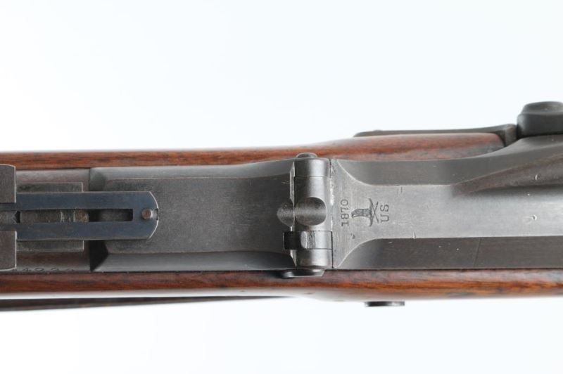 Rifle. Single-Shot. Breech block Action. Produced 1870-1872. Indian Wars period rifle. Springfield Model 1863 rifled musket converted into a breech-loading rifle. 32.6" barrel. 1st variation, 1870-71. Serial #'s match on barrel and receiver. Lock plate stamped "U.S. Springfield' 1863, and Eagle. U.S. marked buttplate. Breech block stamped "1870 US" with eagles head and crossed arrows. Bore is dark, slightly pitted but rifling is present. Hammer and breech block lock up tight. Metal has turned a plum/gray patina with traces of blue on the receiver. Wood is good and has been varnished. 4 inspectors cartouches are visible on the left stock. Cleaning rod present. A correct. Spanish-American war one claw sling attached A rare rifle. NRA Condition-Very Good. Antique Firearm.