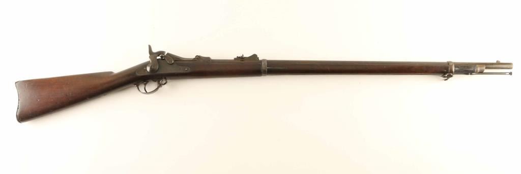 '1879 Pattern' Antique U.S. military breechloading single-shot service rifle chambered in .45-70 Government, manufactured circa 1883. Features a 32.5" tapered barrel, pinned blade front sight affixed to the front sight base/bayonet lug, Model 1877 third variation tangent/flip-up ladder rear sight graduated to 1,200 yards, 3rd variation cleaning rod, stacking swivel, two barrel bands, smooth trigger, knurled hammer spur, 2nd variation lock plate, 1st variation trigger plate/guard, 6th variation breech block, sling swivels and full-length straight grip walnut shoulder stock with "U.S." marked metal buttplate. Markings: Breechblock - "U.S./MODEL/1873". Barrel - "V/P/Eagle Head", "P", "R" & "D". Stock - script "P" inside a circle & "SWP/1883" cartouche. Lock - [Eagle]/[Arrows] & "U.S./Springfield". & both Barrel Bands - "U". Rifle exhibits scattered pin prick pitting throughout, an aged dark brown patina on the barrel, and a mottled light/dark patina on the balance of the metal surfaces with some finish retained on the lock. Action is sound, the three land bore is excellent, markings are good and the wood stock is good to very good with many small blemishes. Condition is NRA Good. ***Antique Firearm***