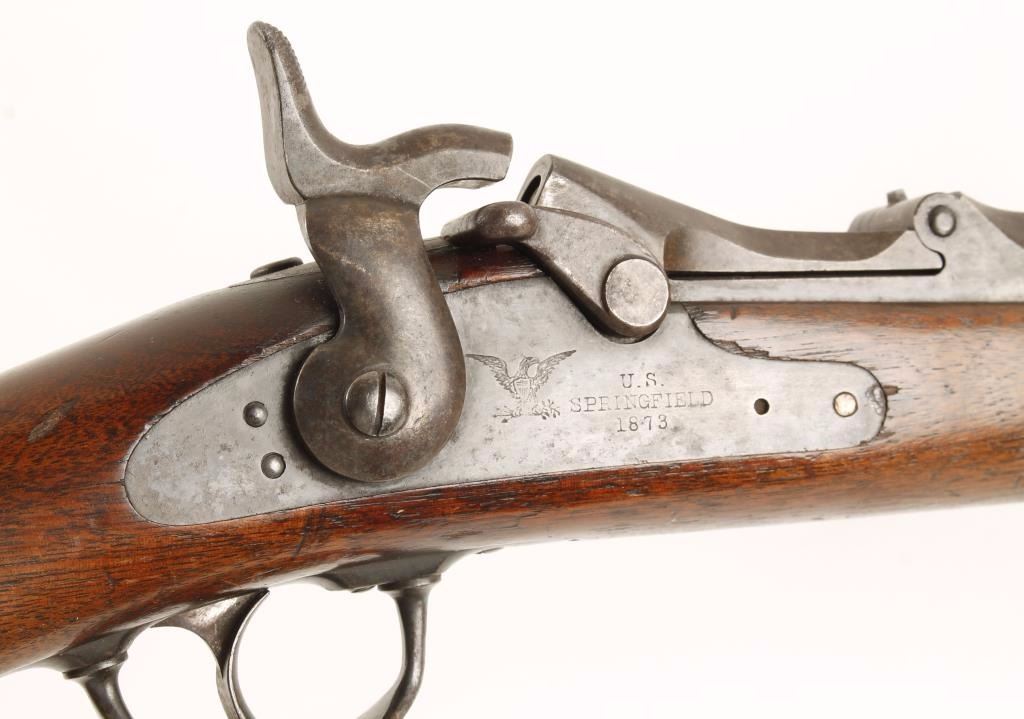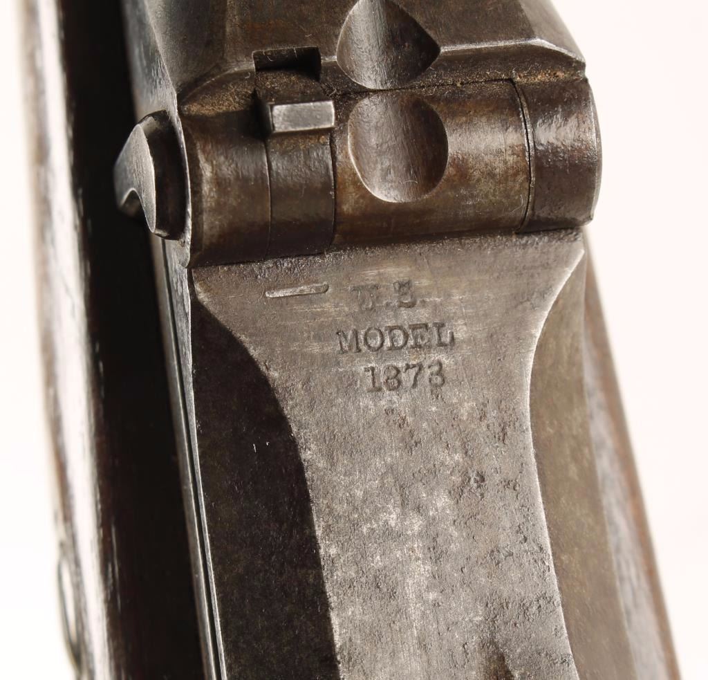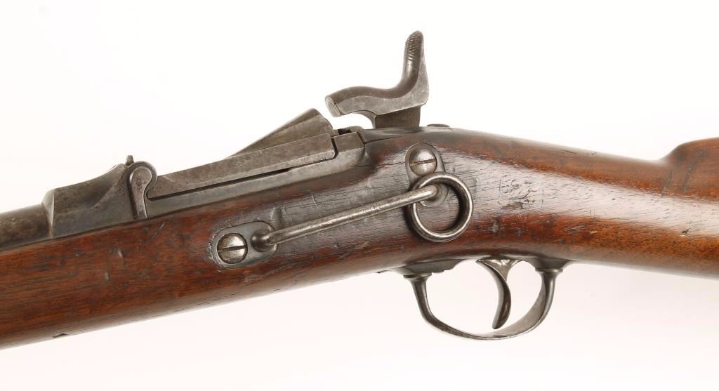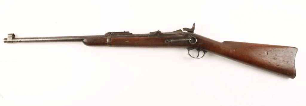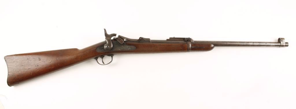 Early United States military single shot trapdoor breechloading carbine chambered in .45-70 Government, circa 1870's. Features a blued 22" barrel, hooded front sight, folding adjustable elevation rear sight, case hardened receiver, saddle ring, cleaning rod, smooth trigger, checkered hammer spur and one piece plain walnut shoulder stock with metal carbine buttplate. Finish on lock retains 50% bluing, barrel shows 50%+ bluing and receiver show deep case colors in protected areas. Markings are clear. Wood sock is in good condition with few dings & mars with a faint cartouche. Action is mechanically sound and bore is excellent. Condition is excellent. ***Antique Firearm***