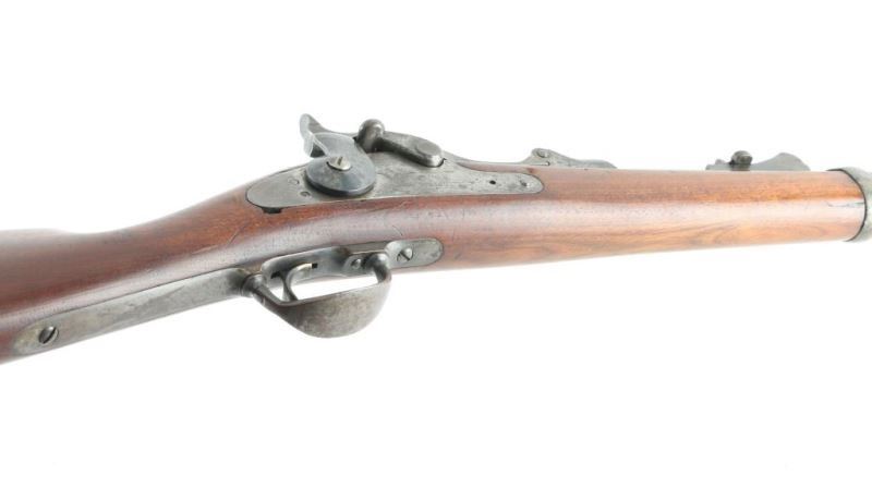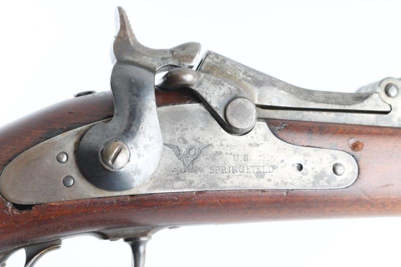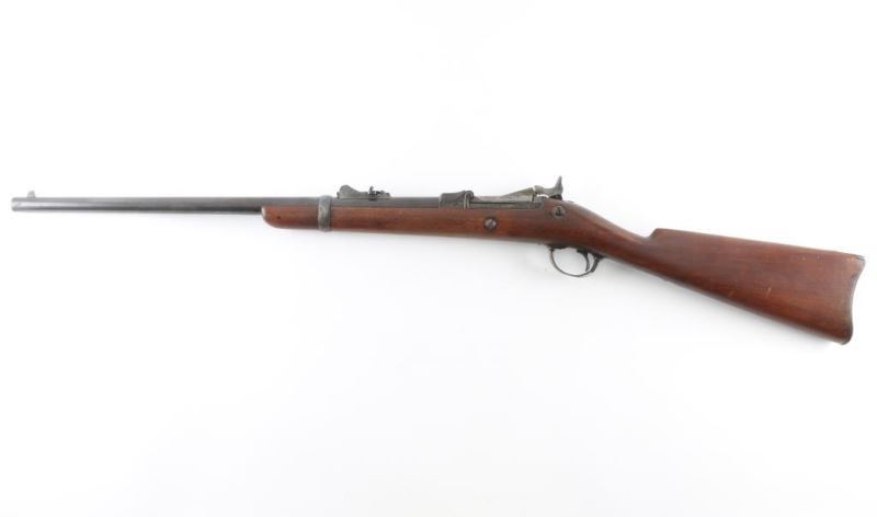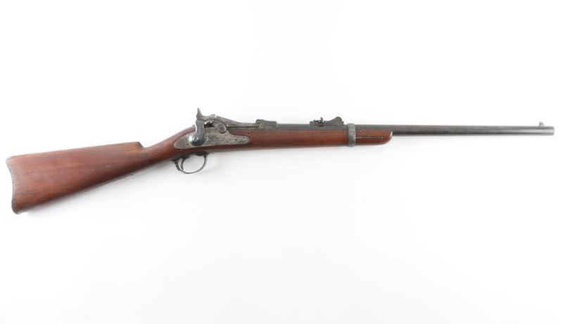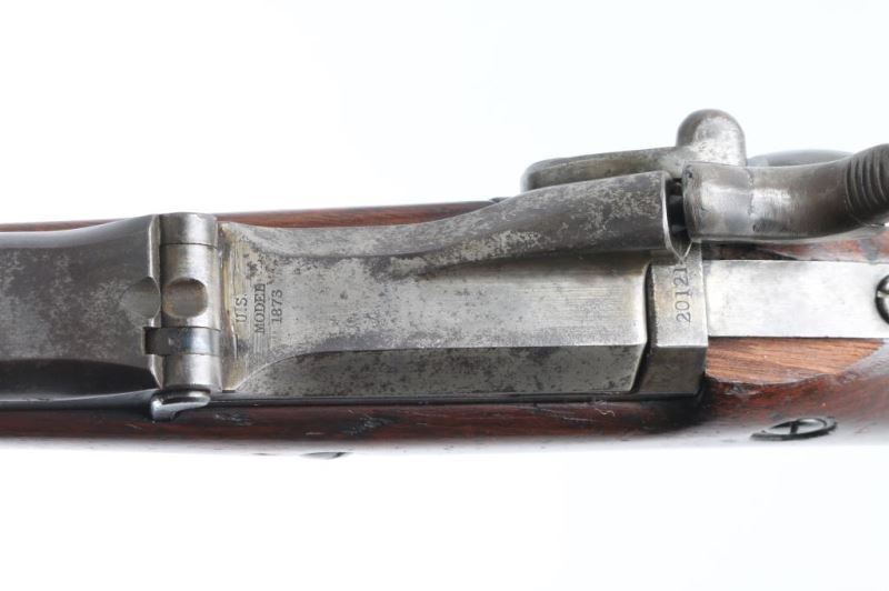 Rifle. Single-Action. Breech Block Action. This is a Infantry Rifle that has been converted to carbine configuration. Barrel shortened to 22 1/2". Rear sights stamped "R" for rifle. lock plate stamped "U.S. Springfield/Eagle" Trapdoor stamped U.S. Model 1873". Buttplate stamped "U.S." Barrel stamped with "V P/Eagle proof" with a additional "P", and "R". No cartouches, or "P" proof visible on wood. There is a repair forward of the barrel band. Hammer has been repaired/altered. Bore is dark/pitted with rifling present. Hammer/trapdoor lock up tight. barrel has turned a plum color with traces of blue. receiver, triggerguard, and buttplate have turn a gray patina with pitting. hammer has traces of blue. NRA Condition-Near Good as Altered. Antique firearm.