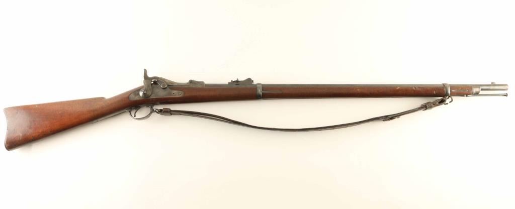 Rifle. Breech-Block Action. U.S. Military issue of the Indian Wars, Spanish-American war period. 32" barrel with correct early, ladder rear sight. U.S. Springfield /Eagle marked lock plate, Breech block marked US Model 1873. VP?eagle proofed barrel. U.S. marked butt plate. Serrated trigger. "SWP" 1884 cartouche stamped above trigger on left stock wrist. "P" proof mark on underside of stock. Blued metal finish is about 40%, . Bore appears very good/bright. Hammer/breech block lock up tight. Blued cleaning rod present. Comes with a original, one claw, SAW period sling. A really nice conditioned early Trapdoor. NRA Condition-Antique Fine. Antique Firearm.