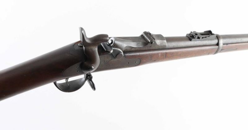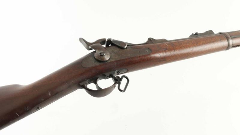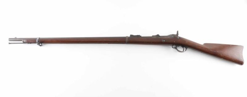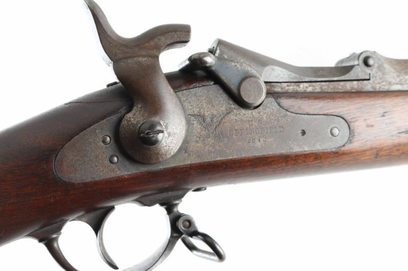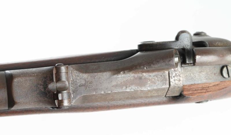 US military single shot rifle features 32" barrel, blade front sight, tangent rear sight with elevator ladder, cleaning rod, sling swivels, stacking swivel, external hammer. Bore is poor condition, dark & corroded with traces of rifling. Metal surfaces show as mostly patina brown, some gray color in protected areas, bare metal showing on edges, patina and some pitting on breech and lock plate. Stock is very good condition with small creases & dents. Breech block is dated 1873. Cartouche on left wrist under hammer shows oval shape (letters inside hard to read). "P" in circle in stock below lower tang. Buttplate marked "US" on forward top edge. "Springfield" on lock plate partially eroded. Number "49" in paint on toe line of stock. Condition is NRA Very Good *** Antique Firearm ***