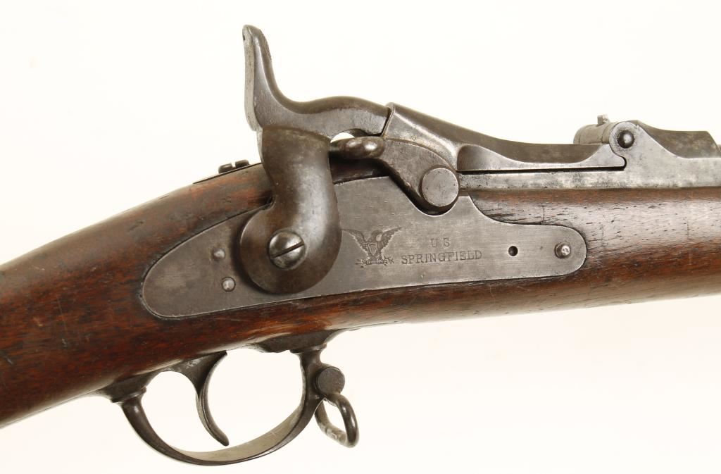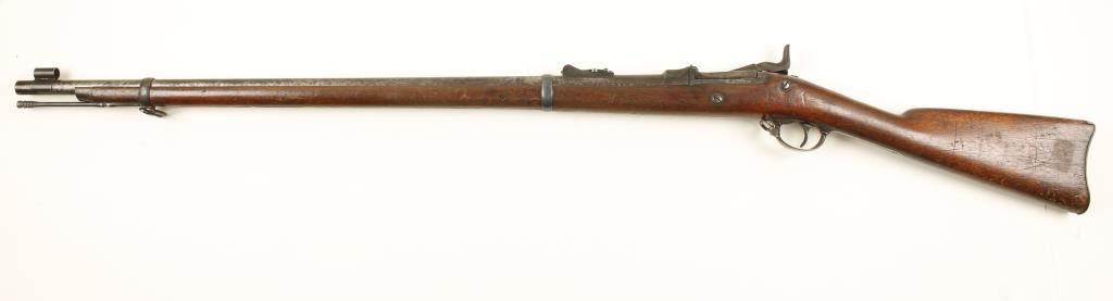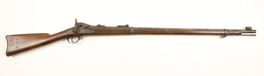 Blued breechloading US military rifle with a 32.5" barrel. Barrel is mottled grey/brown with surface rust, rust stains, some pitting and scrapes. Lock plate is stamped "US Springfield" with no date."Model 1873" is stamped on breechblock. Butt plate has a large dent in the heel. Wood has letters "N. G. H. G 17" stamped in it. Front sight is hooded and rear ladder sight is adjustable for elevation (but it is loose). Wood has cracks from the butt plate forward and by the head of the rear lock plate screw. Bore is dirty but shiny with light rifling. Action works well. Condition is fair. *Antique Firearm*