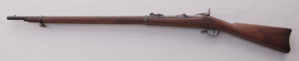 Springfield Model 1873 Trapdoor Rifle, #212537, .45-70 cal., 32-1/2'' barrel, blue finish, walnut stock, early 1873 rifle sight, 1873 dated breechblock. Condition is good to very good with approx. 30% thinning and toning arsenal blue to barrel. Breechblock shows 80% arsenal blue. Stock with moderate scuffs and dings. Action functions correctly, bore is very good. Ramrod is missing.