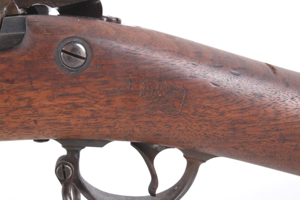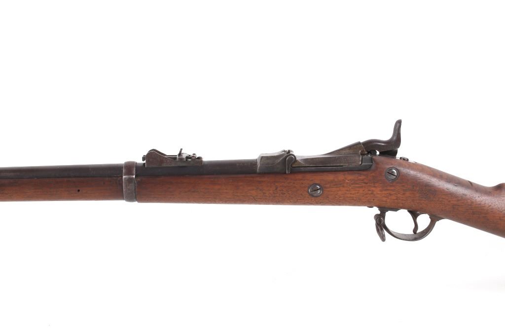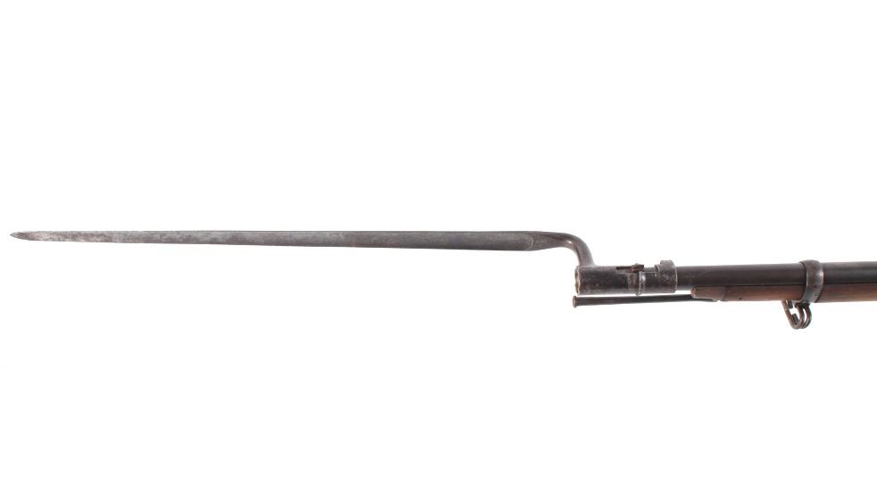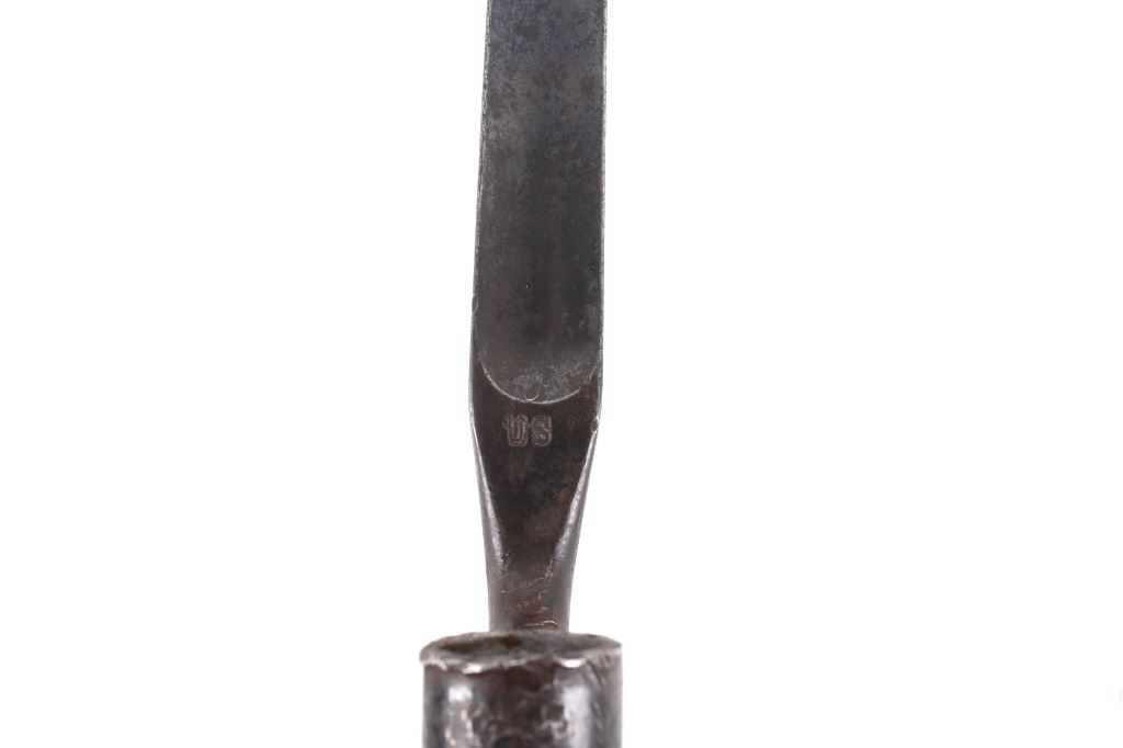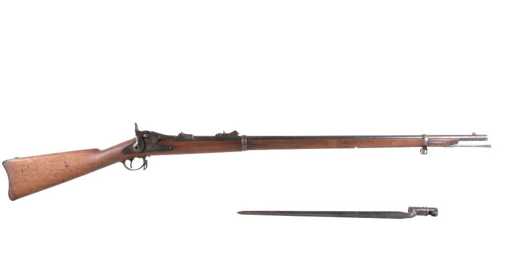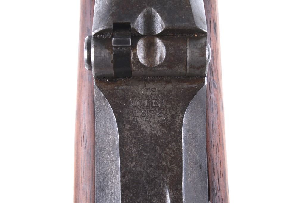 Featured in this lot is a U.S. Springfield M1878 Trapdoor rifle / musket chambered in .45-70 and original bayonet. The rifle features a 32 1/2" barrel, trapdoor action, external hammer, adjustable sights, walnut stock, cleaning rod, and blue'd finish. This one has a beautiful unblemished stock and fore-end with desirable 1883 dated inspector cartouche in the left side of the stock. This rifle also features a deep full blue finish, showing only normal aging, and has excellent markings, including the “U.S. SPRINGFIELD” with sharp full eagle on the lock plate and correct “U.S. MODEL 1873” on the breech block. The bore on this example is shiny with strong rifling and some darkness in the lands. This rifle is complete with 1884 style cleaning rod. This rifle was manufactured in 1884/1885. The rifle comes with its original Springfield tri edge bayonet. The bayonet is marked "U.S." across the blade. Serial Number: 248414. This firearm qualifies as an Antique and does not require FFL Transfer or NICS Background Check.