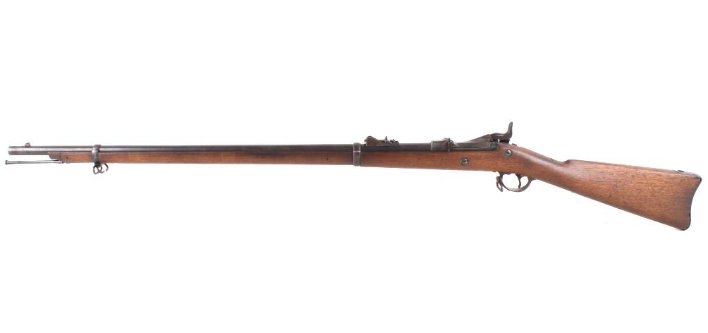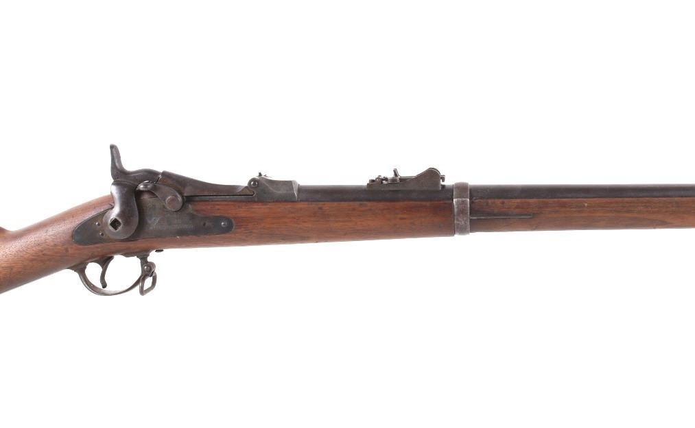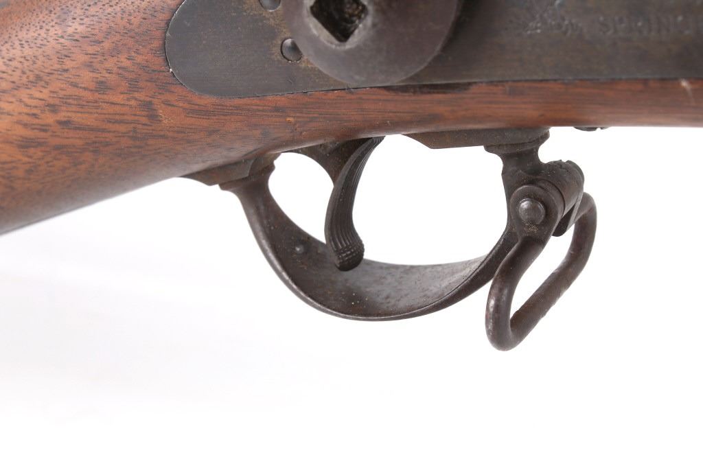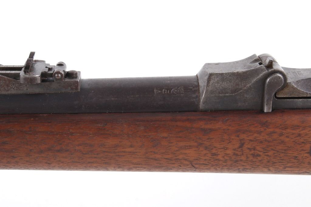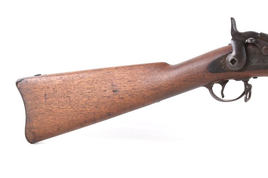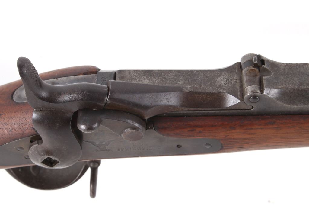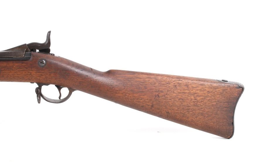 Featured in this lot is a U.S. Springfield M1878 Trapdoor rifle / musket chambered in .45-70 and original bayonet. The rifle features a 32 1/2" barrel, trapdoor action, external hammer, adjustable sights, walnut stock, cleaning rod, and blue'd finish. This one has a beautiful unblemished stock and fore-end with desirable 1883 dated inspector cartouche in the left side of the stock. This rifle also features a deep full blue finish, showing only normal aging, and has excellent markings, including the “U.S. SPRINGFIELD” with sharp full eagle on the lock plate and correct “U.S. MODEL 1873” on the breech block. The bore on this example is shiny with strong rifling and some darkness in the lands. This rifle is complete with 1884 style cleaning rod. This rifle was manufactured in 1884/1885. The rifle comes with its original Springfield tri edge bayonet. The bayonet is marked "U.S." across the blade. Serial Number: 248414. This firearm qualifies as an Antique and does not require FFL Transfer or NICS Background Check.