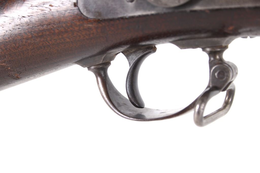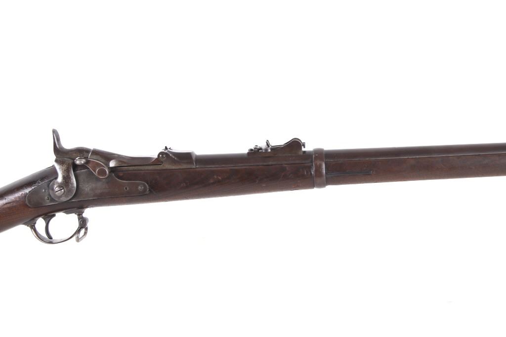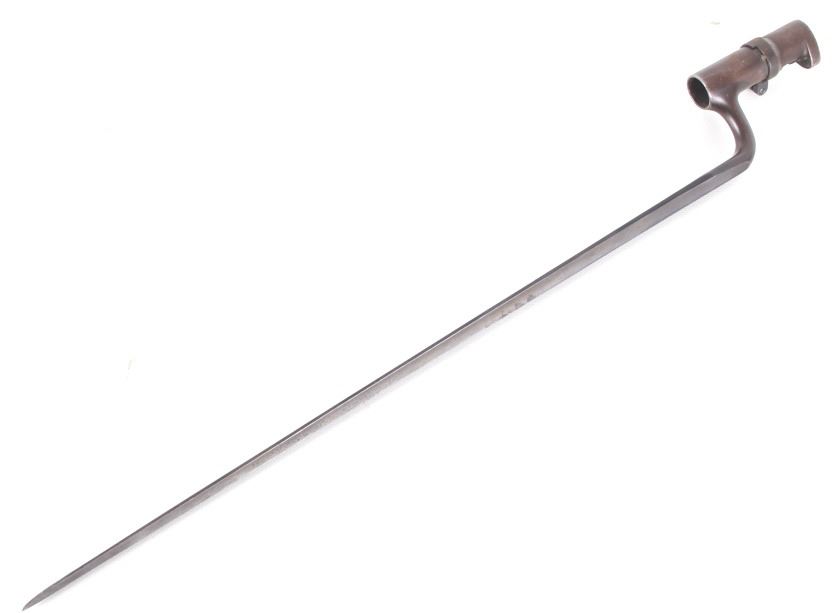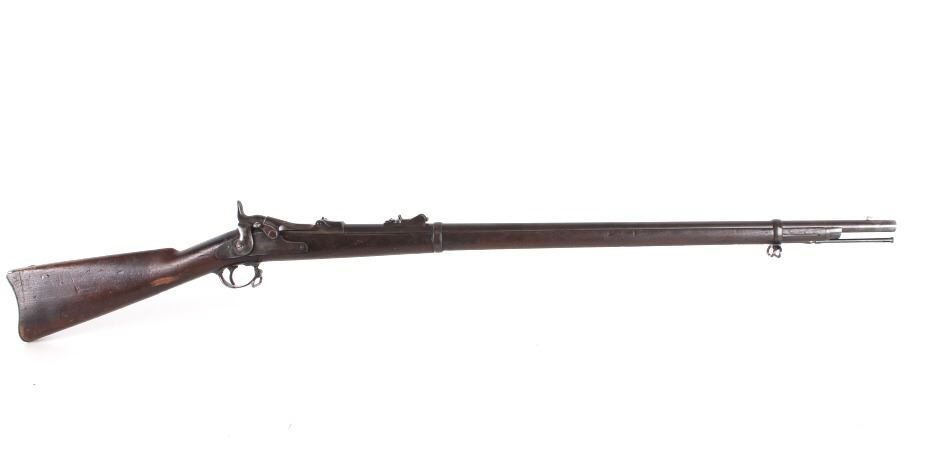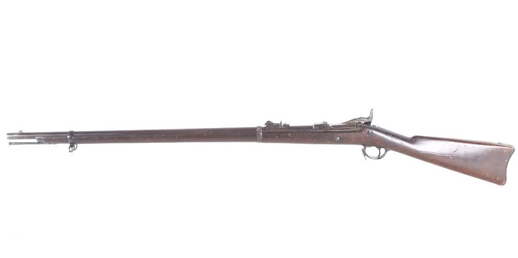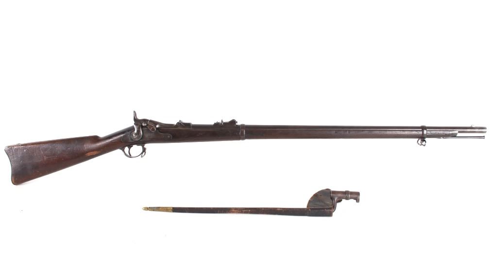 Featured in this lot is a U.S. Springfield M1878 Trapdoor rifle/musket chambered in .45-70 and original bayonet. The rifle features a 32 1/2" barrel, trapdoor action, external hammer, adjustable sights, walnut stock, cleaning rod, and blue'd finish. This one has a beautiful unblemished stock and fore-end with desirable 1883 dated inspector cartouche in the left side of the stock. This rifle also features a deep, full blue finish, showing only normal aging, and has excellent markings, including the “U.S. SPRINGFIELD” with sharp full eagle on the lock plate and correct “U.S. MODEL 1873” on the breech block. The bore on this example is shiny with strong rifling and clean barrel. This rifle is complete with 1884 style cleaning rod. This rifle was manufactured in 1884/1885. The rifle shows good condition overall with some wear and damage due to age and use. The rifle comes with its original Springfield tri edge bayonet. The bayonet is marked "U.S." across the blade. Serial Number: 230647. This firearm qualifies as an Antique and does not require FFL Transfer or NICS Background Check.