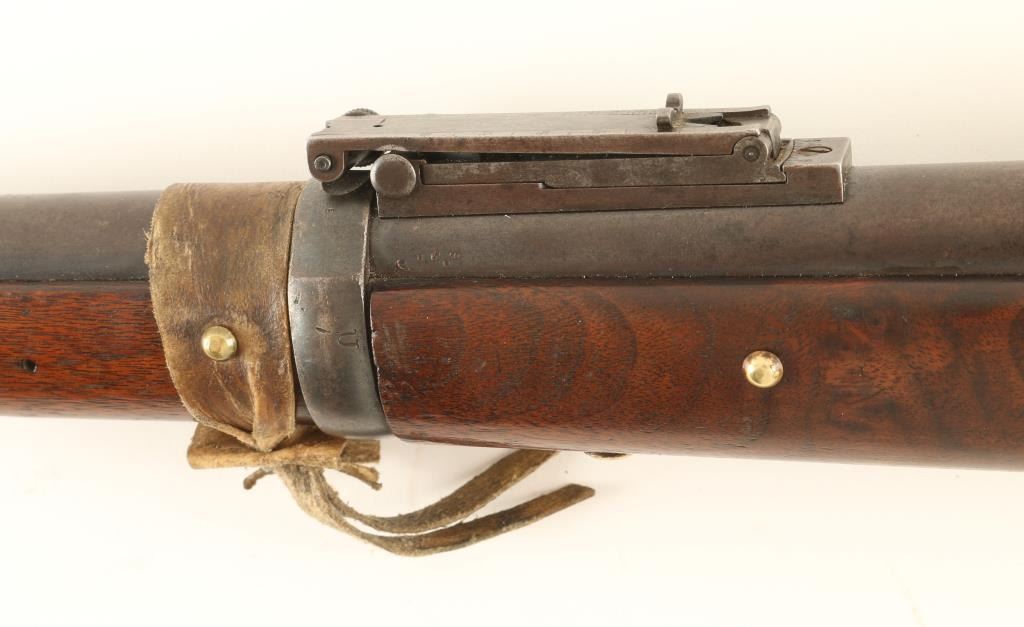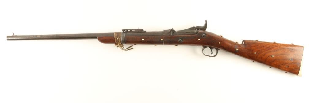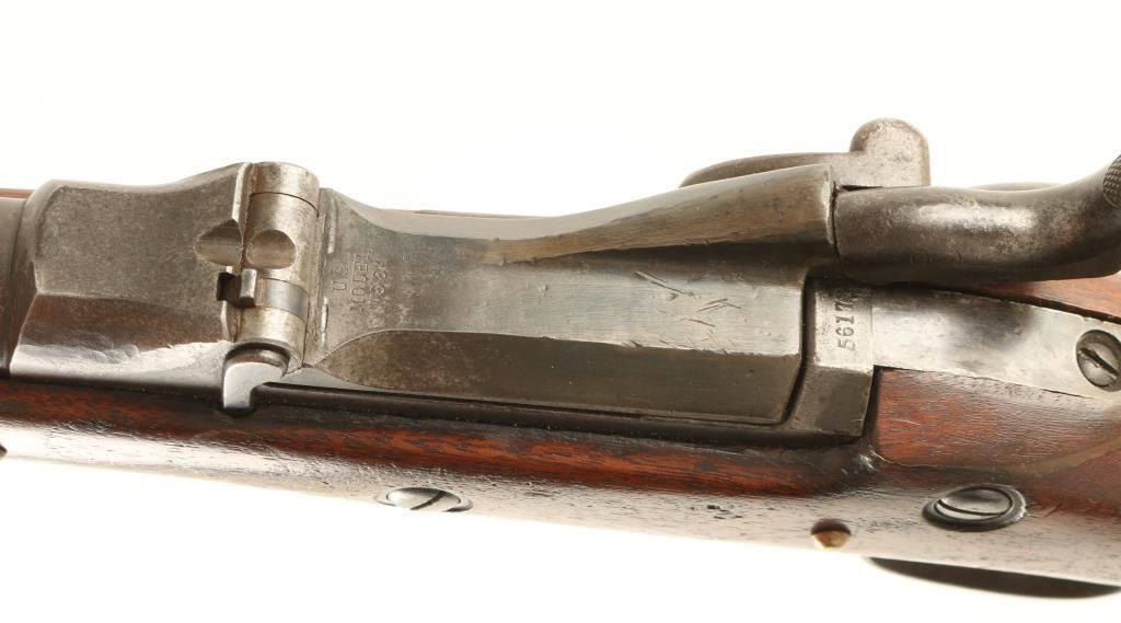 Sporterized U.S. Military breechloading trapdoor single shot rifle chambered in .45-70. Features a cut down 23.5" tapered barrel, rawhide & steel barrel bands, custom post front sight, Buffington rear adjustable sight, case hardened breech, serrated trigger, checkered hammer spur, and one piece walnut shoulder stock adorned with brass tacks & stag buttplate. Finish on barrel has turned to brown patina while the breech & lock show some remaining finish with a dark overall appearance. Action is sound, bore is fair, and wood stock is very good as refinished with an old repair around the upper tang. Condition is very good. ***Antique Firearm***